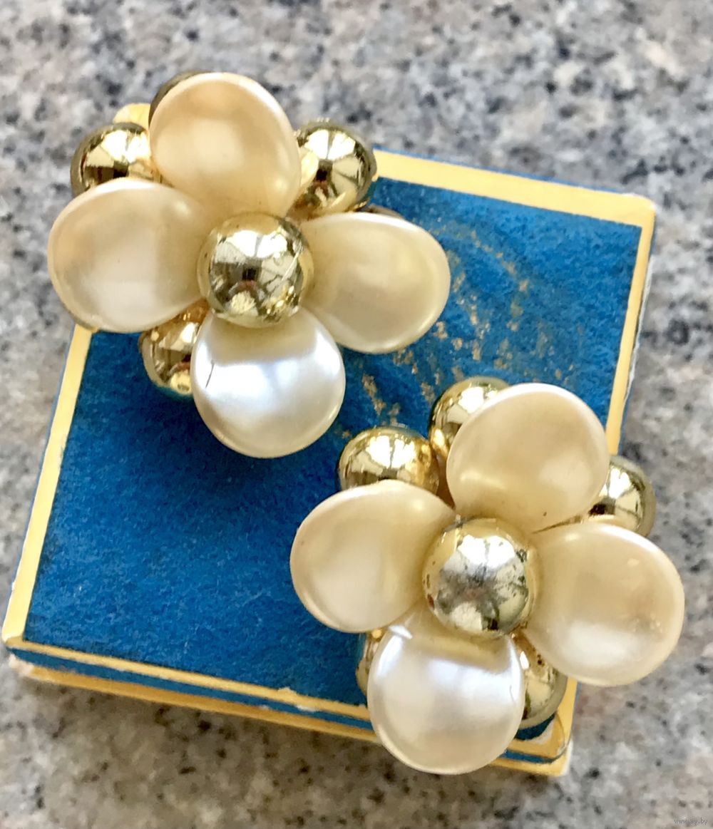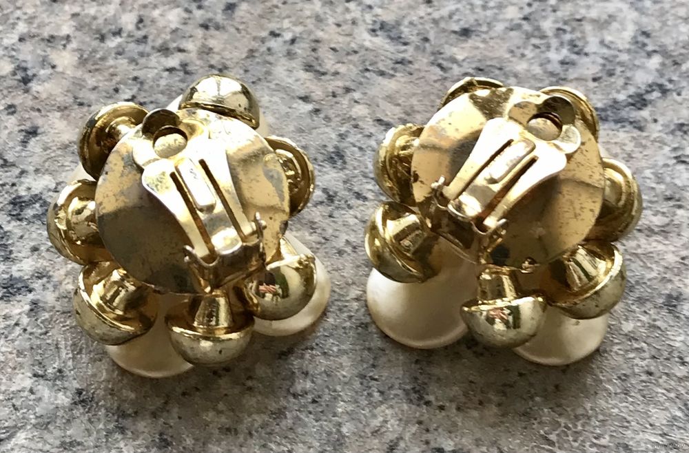 Винтажные крупные клипсы из пластика. На центральных бусинах есть потёртости позолоты. Высота 3см. Замочки работают исправно.