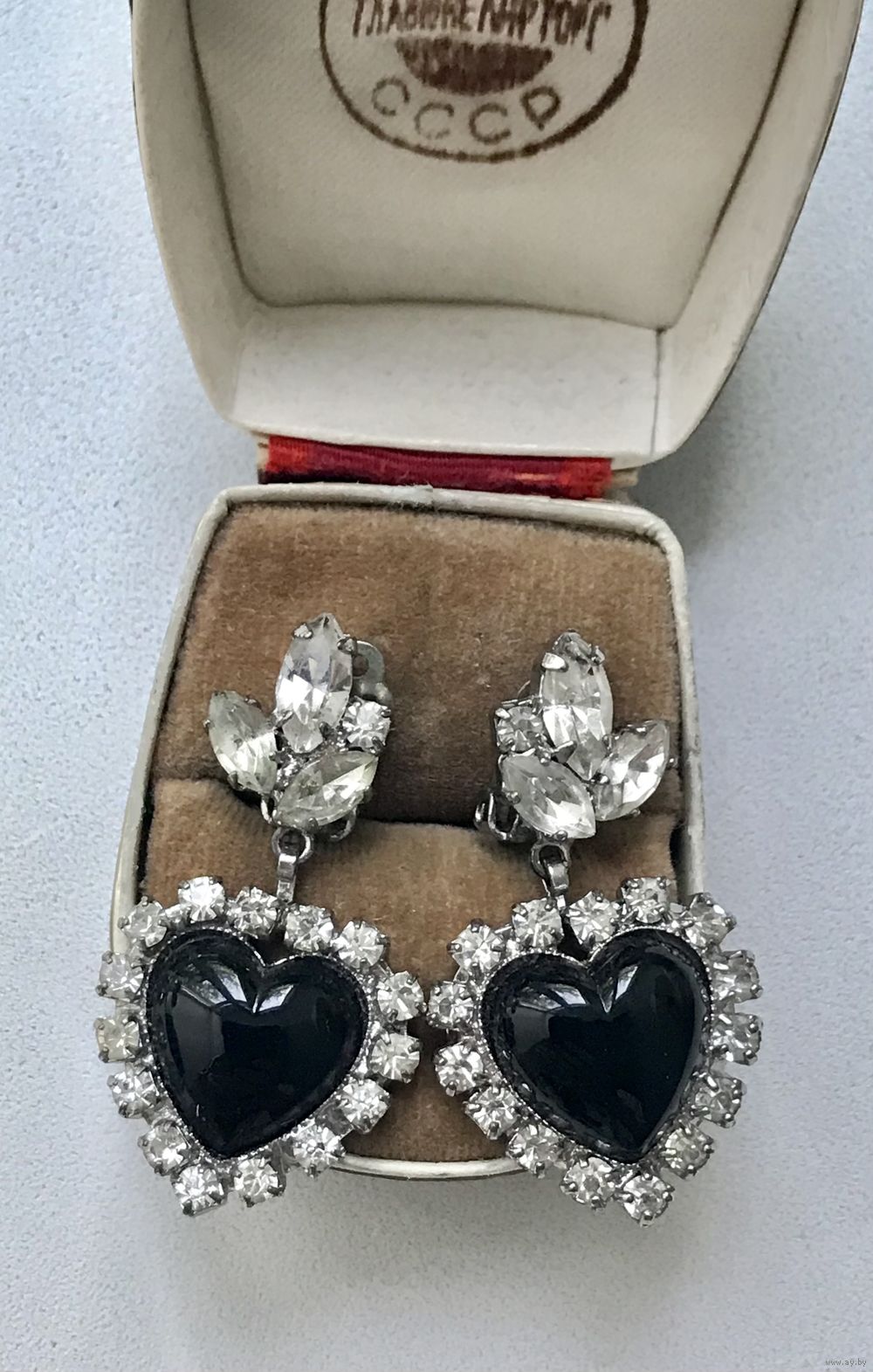 Крупные винтажные чешские клипсы. Основа выполнена из латуни с серебристым покрытием, вставки из стекла. Высота клипсы 4,3см., размер подвески 2,3х2,3см. Состояние хорошее.