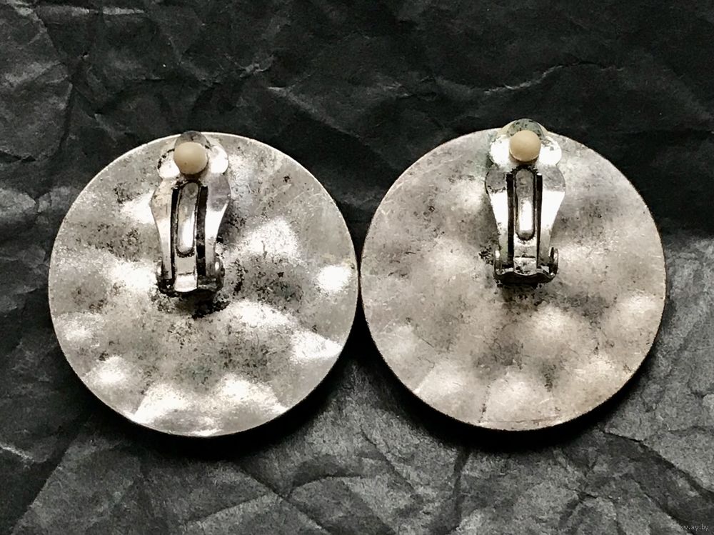 Крупные эффектные винтажные клипсы с основой из металла серебристого тона (очень похож на пьютер) и вставок из цветного пластика. На центральных вставках имеются незначительные потёртости. Клипсы довольно тяжёлые. Диаметр 3,8см.