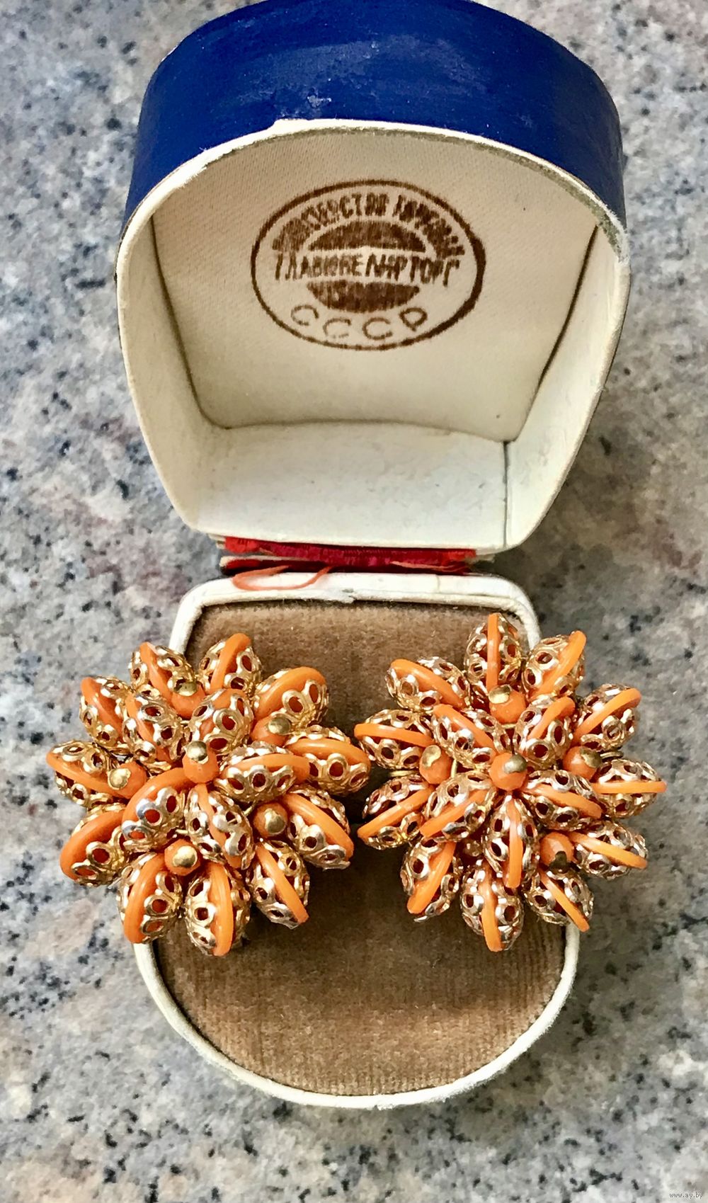 Винтажные клипсы W.Germany с основой из латуни, на лицевой стороне бусины из пластика в латунных шапочках. Диаметр клипсы 3см. Маркированы. Состояние хорошее.