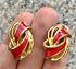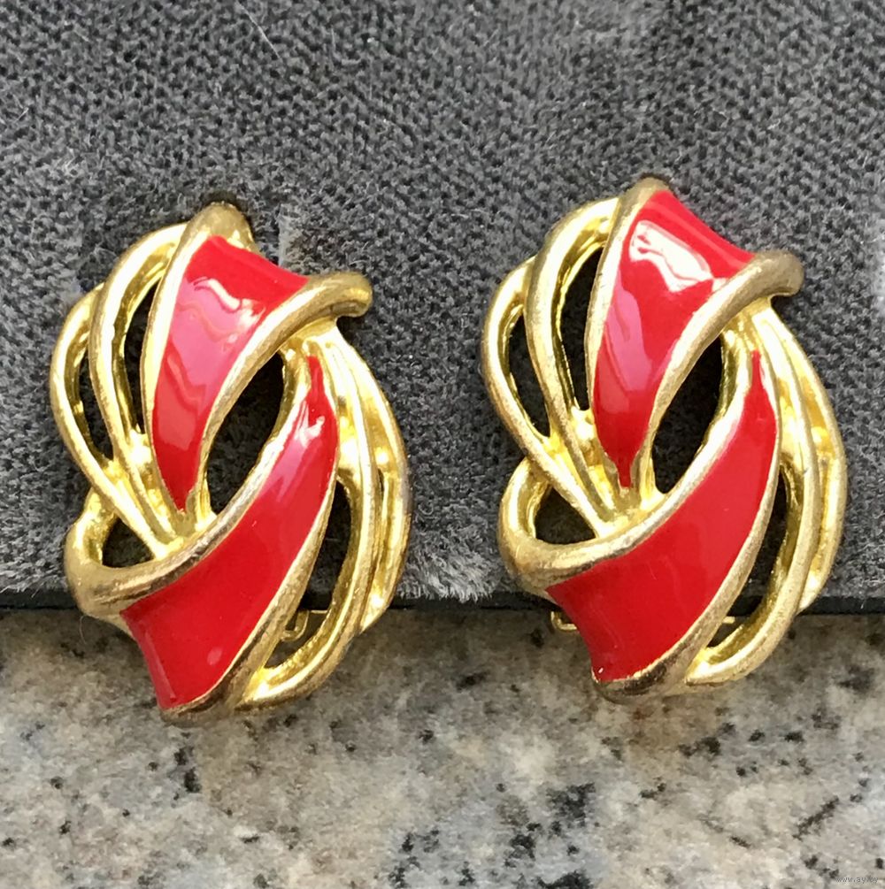 Клипсы с основой из металла золотистого тона, лицевая сторона украшена эмалью ярко-красного цвета. Размер клипсы 2,5х1,5см. Замочки держат надёжно. Состояние хорошее.