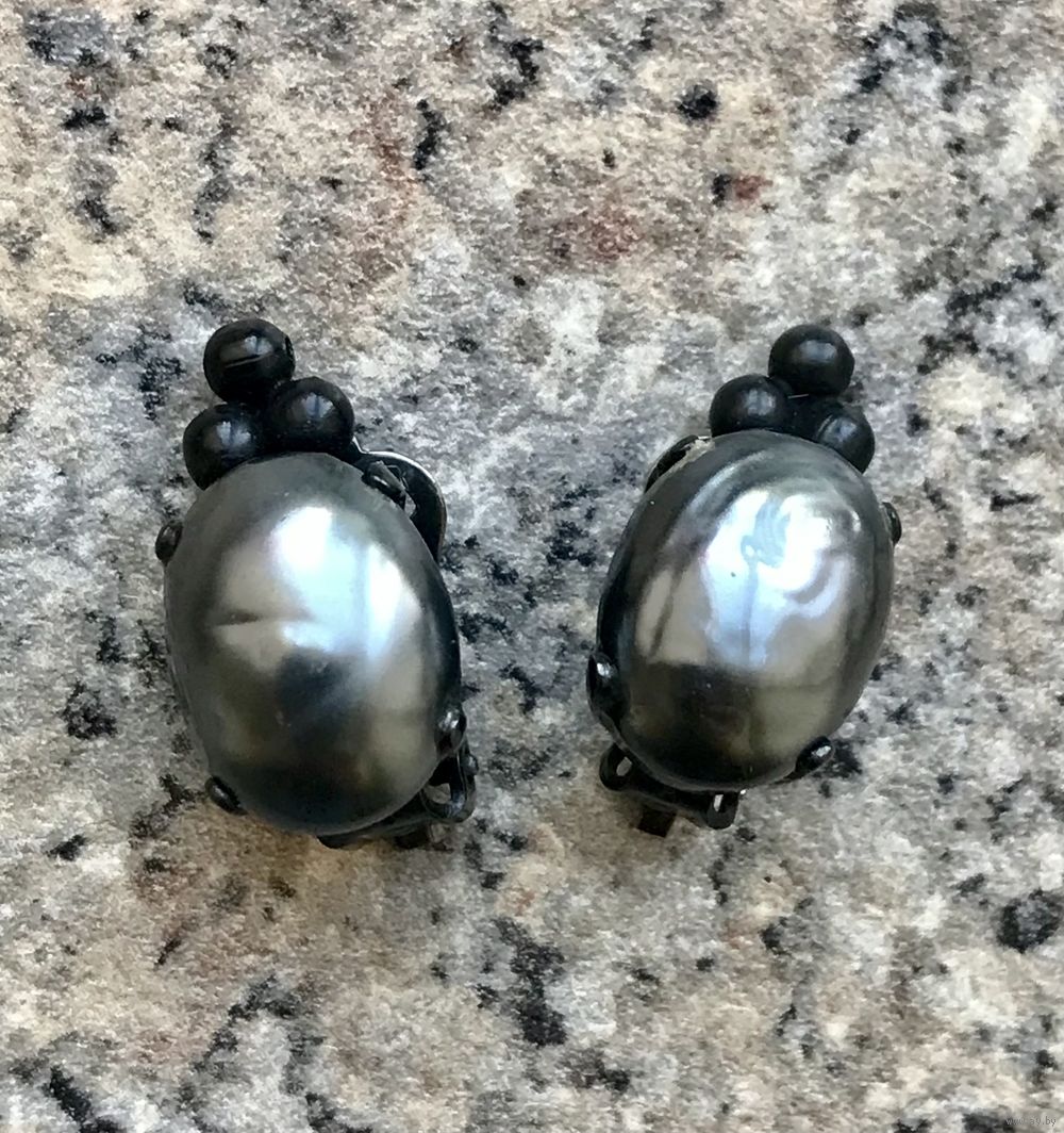 Клипсы среднего размера, основа выполнена из металла, вставка из стекла под барочный черный жемчуг. Высота клипсы 2см., размер вставки 1,4х1см. Маркированы. Состояние хорошее.