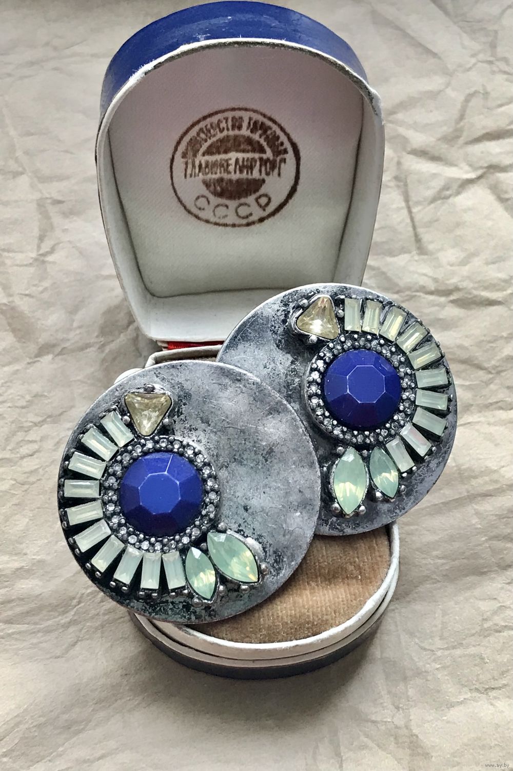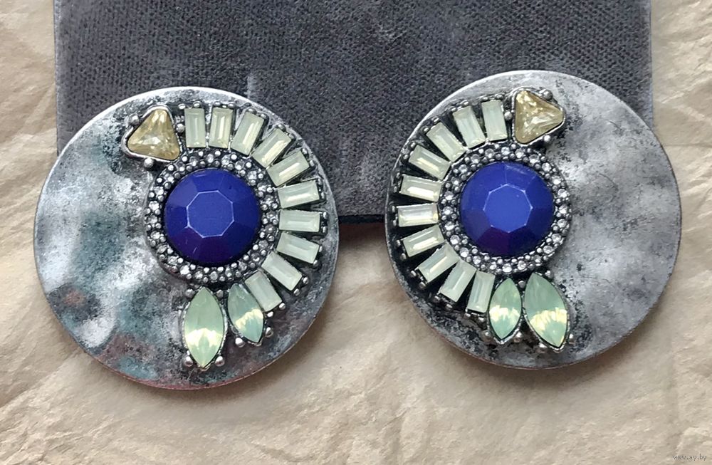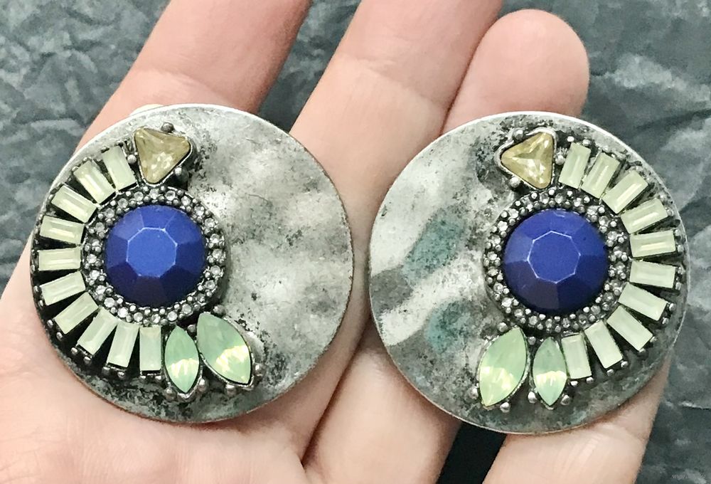 Крупные эффектные винтажные клипсы с основой из металла серебристого тона (очень похож на пьютер) и вставок из цветного пластика. На центральных вставках имеются незначительные потёртости. Клипсы довольно тяжёлые. Диаметр 3,8см.