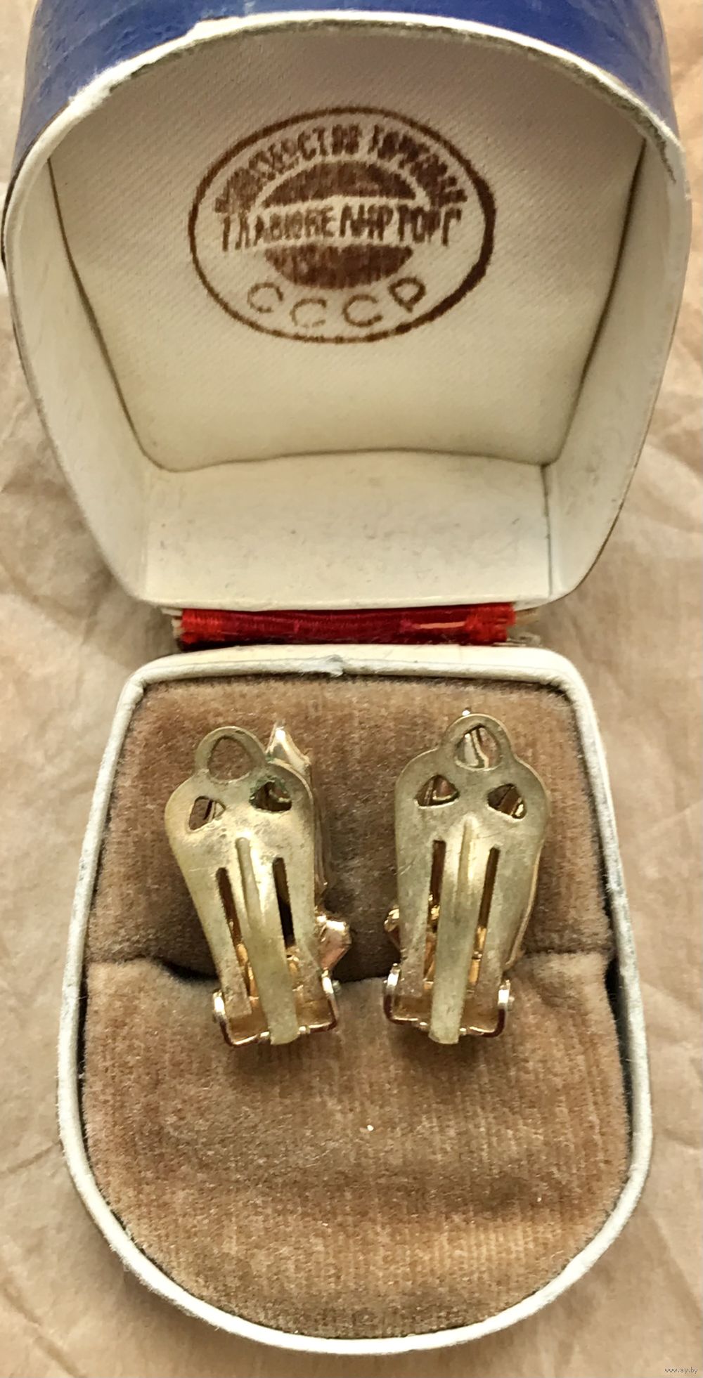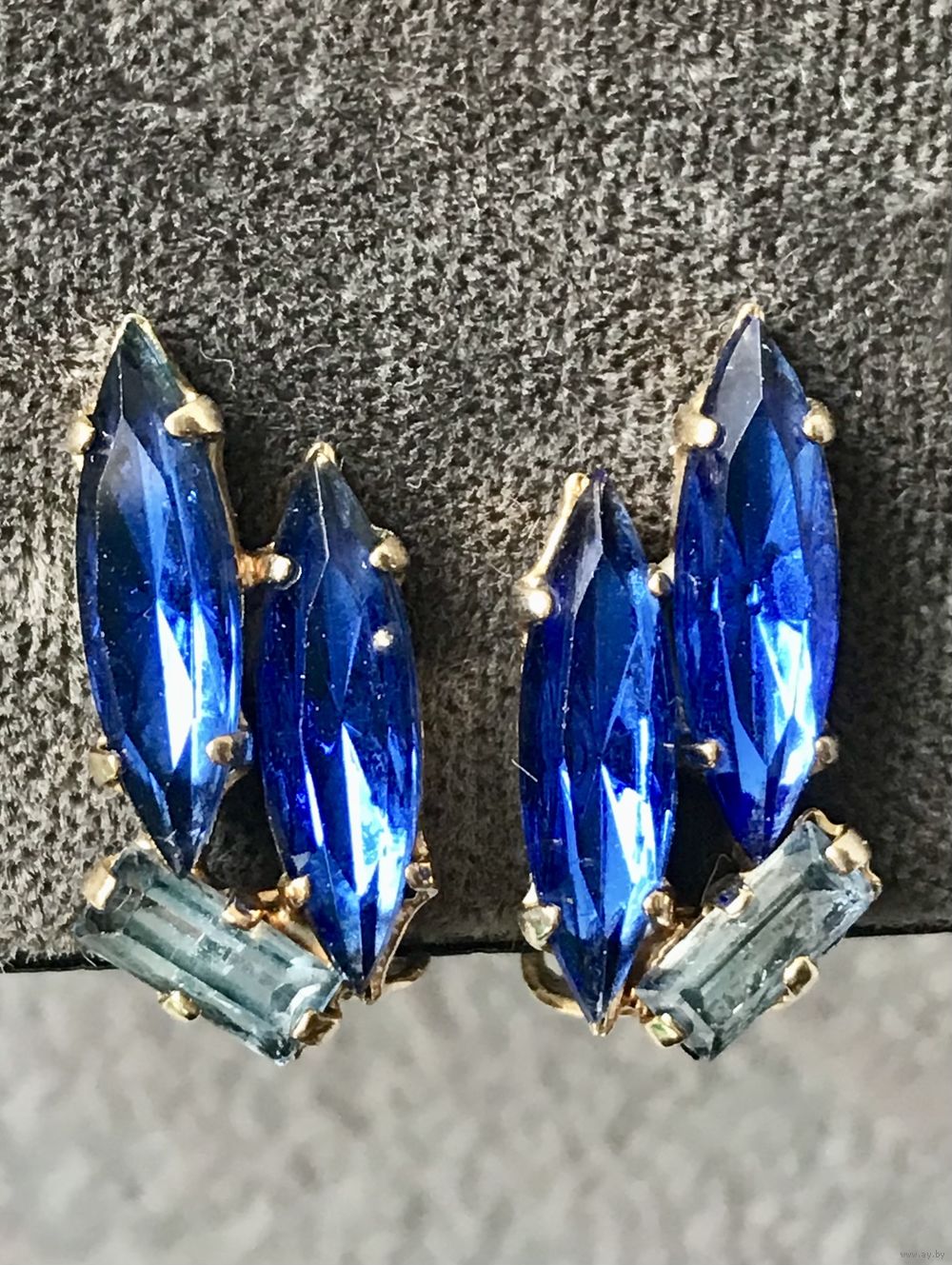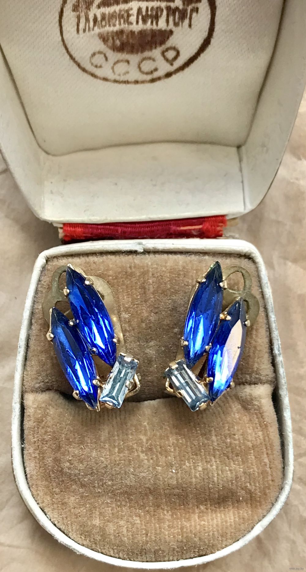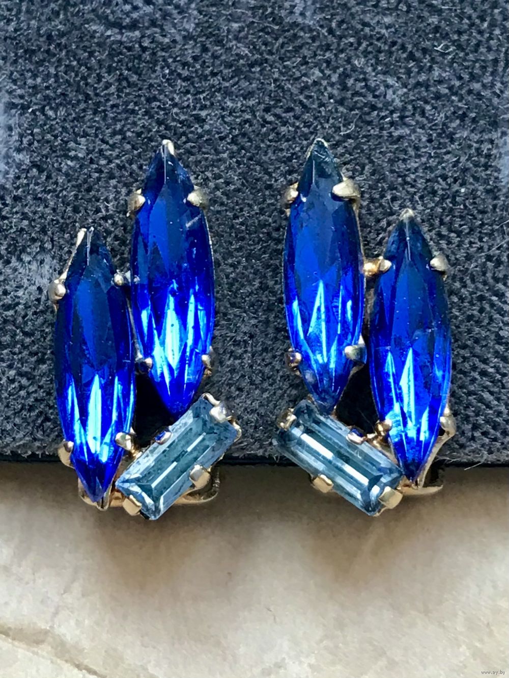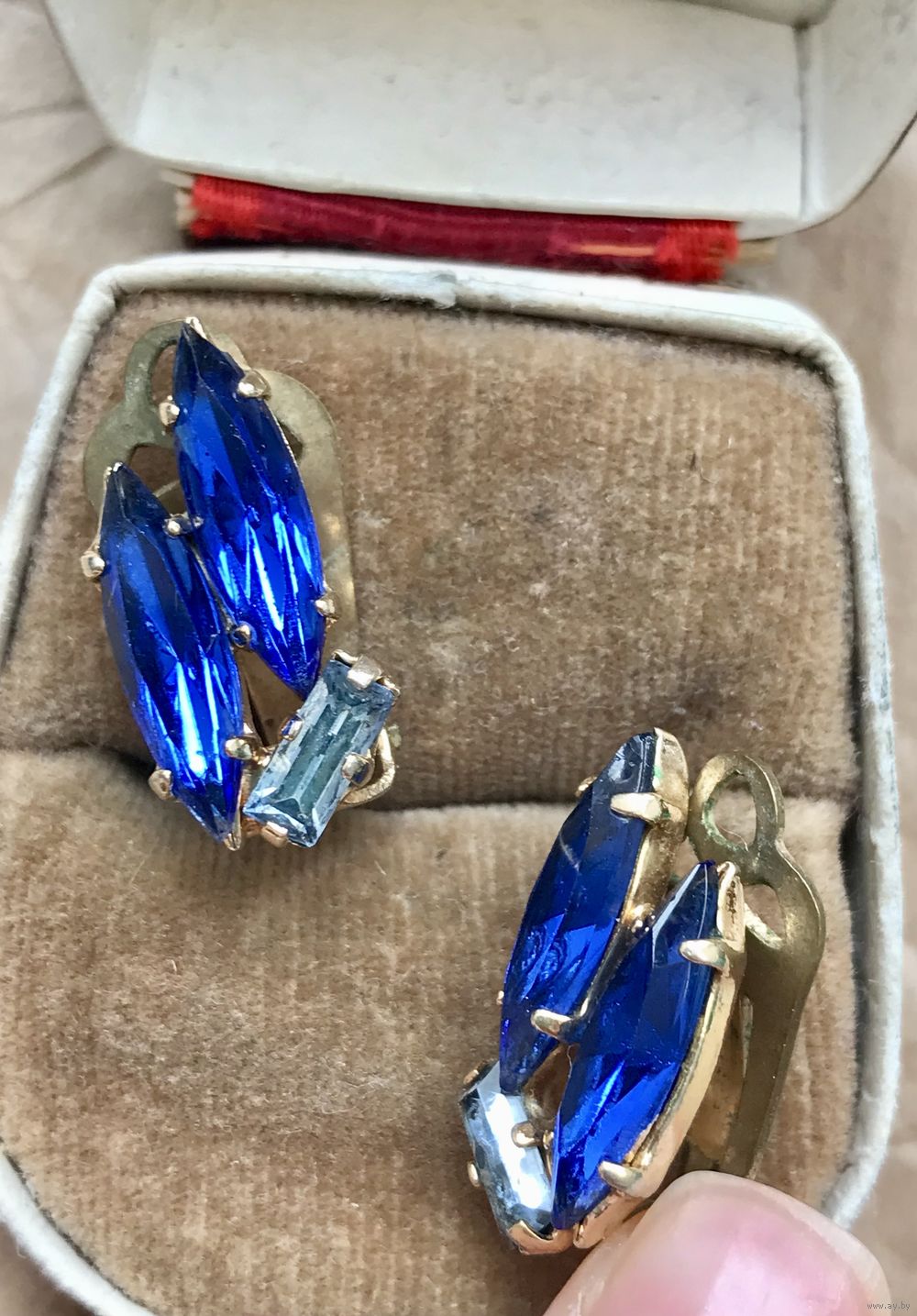 Винтажные чешские клипсы с основой из латуни с позолотой, вставки из цветного стекла. На одной вставке незначительный скол (учтено в цене). Высота клипсы 2см.