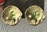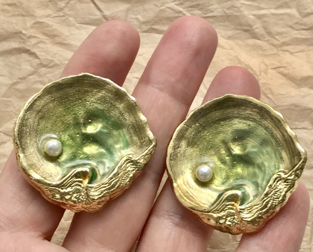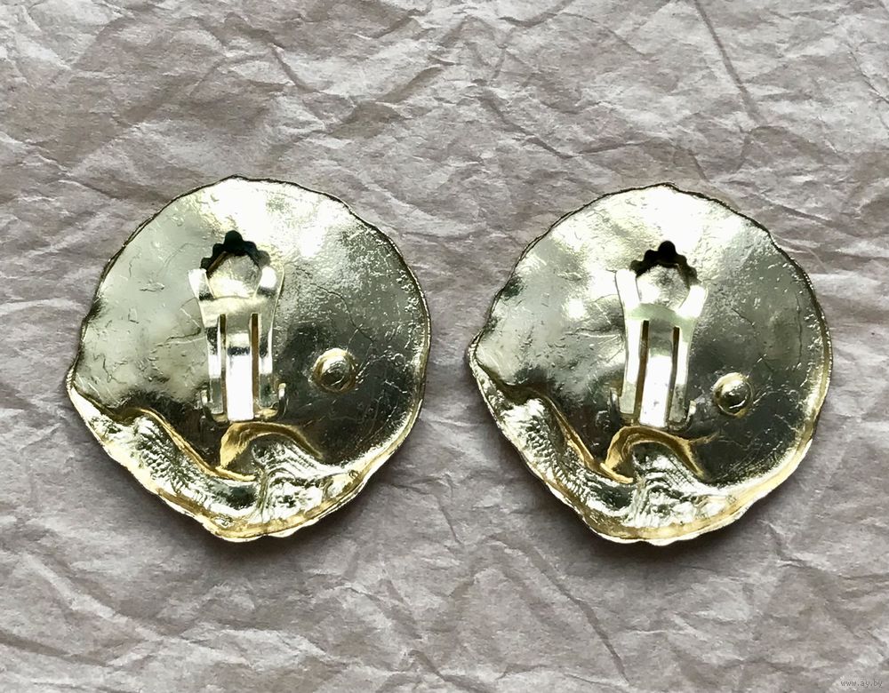 Крупные эффектные винтажные клипсы с основой из металла золотого тона, лицевая сторона украшена эмалью и небольшой бусиной под жемчуг (на обеих бусинах есть небольшой сход покрытия, в носке не заметно). Диаметр клипсы 3,7см. Клипсы хоть и крупные, но не тяжёлые.