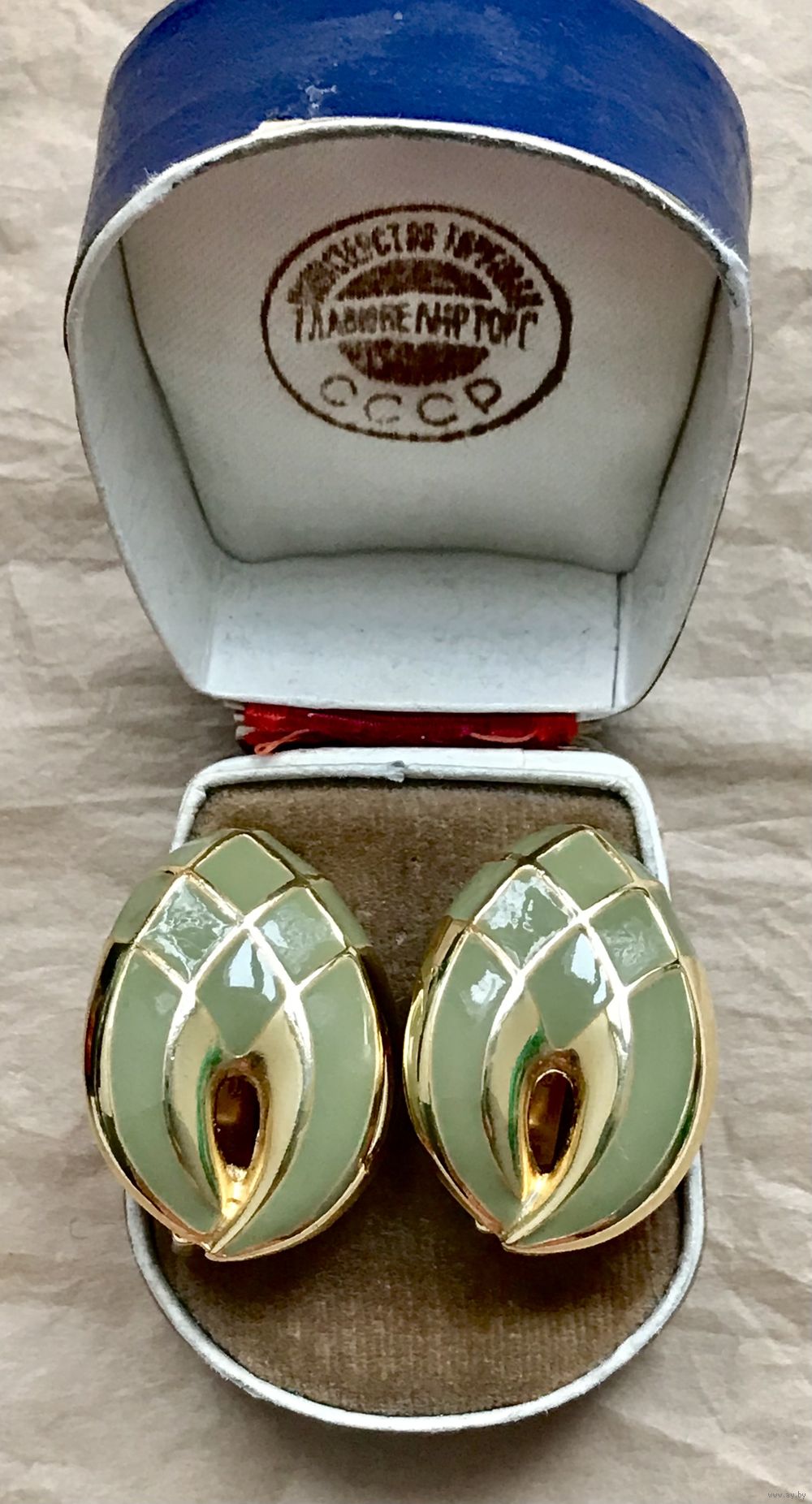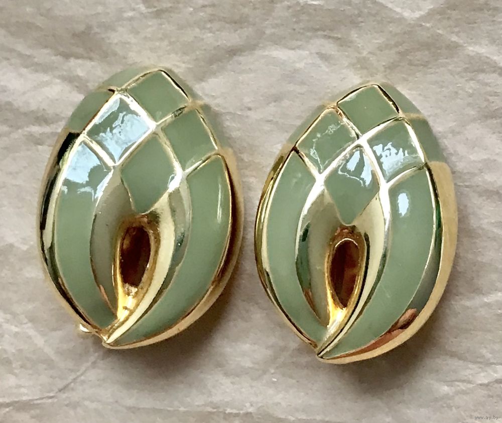 Крупные винтажные клипсы из металла золотого тона. Лицевая сторона украшена эмалью. Размер клипсы 3х2см. Тяжёленькие. Состояние хорошее.