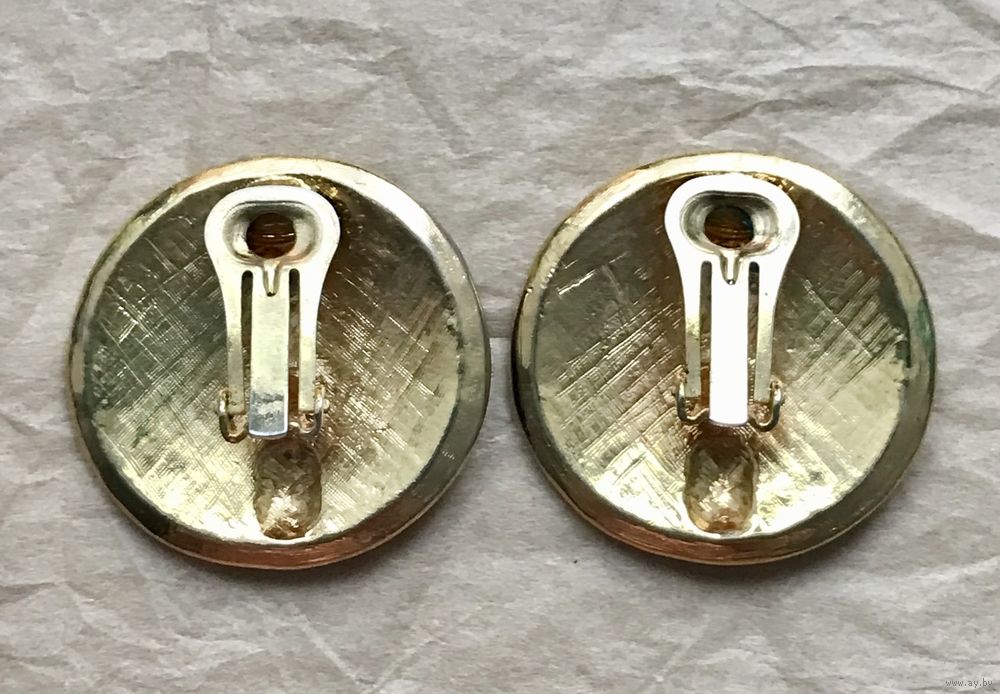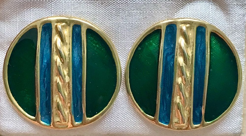 Крупные винтажные клипсы с основой из металла золотого тона, лицевая сторона украшена яркими эмалями. Диаметр клипсы 3,2см. Тяжёленькие. Состояние хорошее.