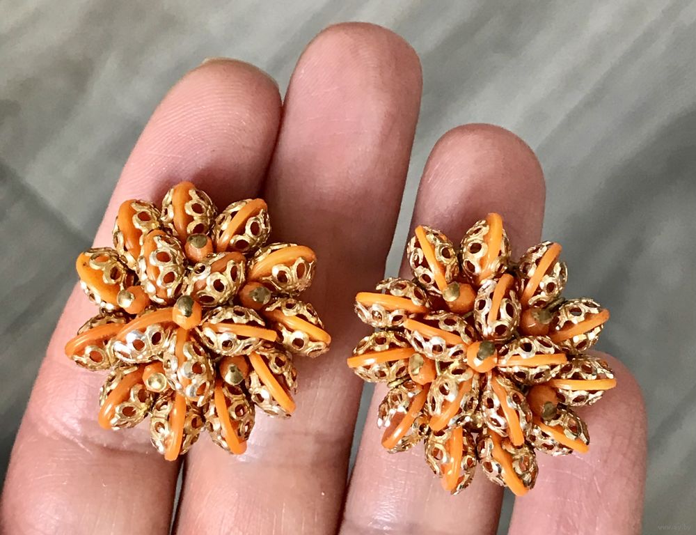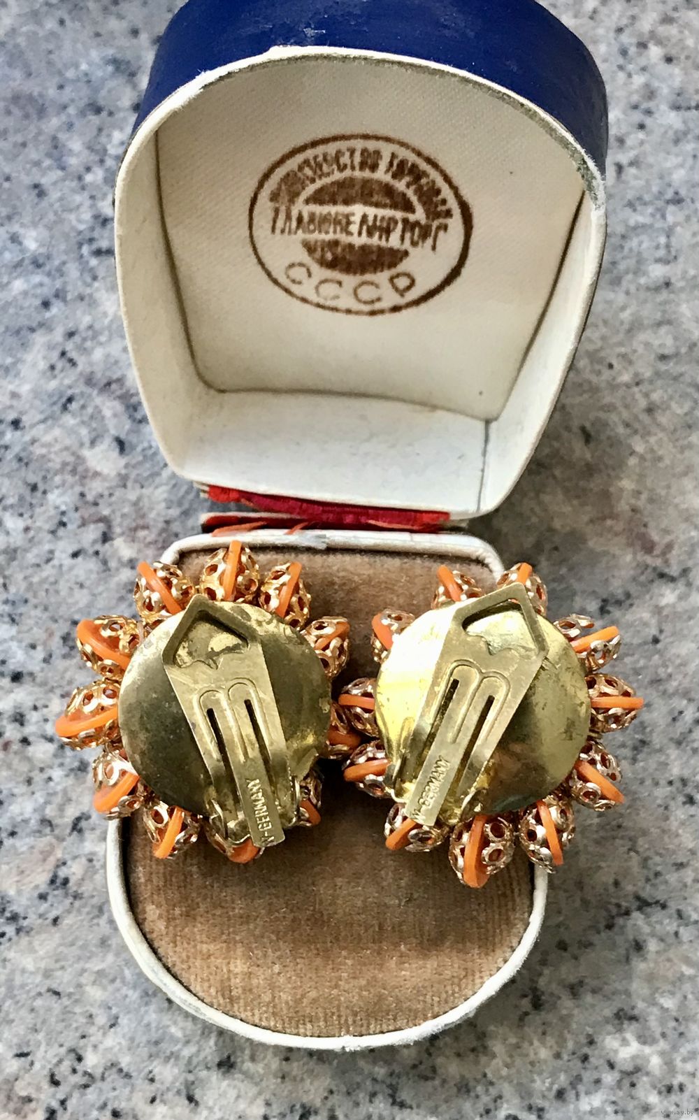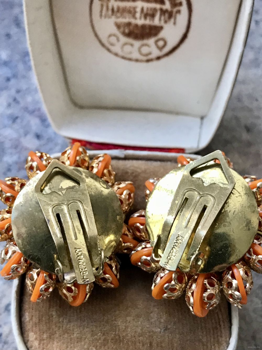 Винтажные клипсы W.Germany с основой из латуни, на лицевой стороне бусины из пластика в латунных шапочках. Диаметр клипсы 3см. Маркированы. Состояние хорошее.