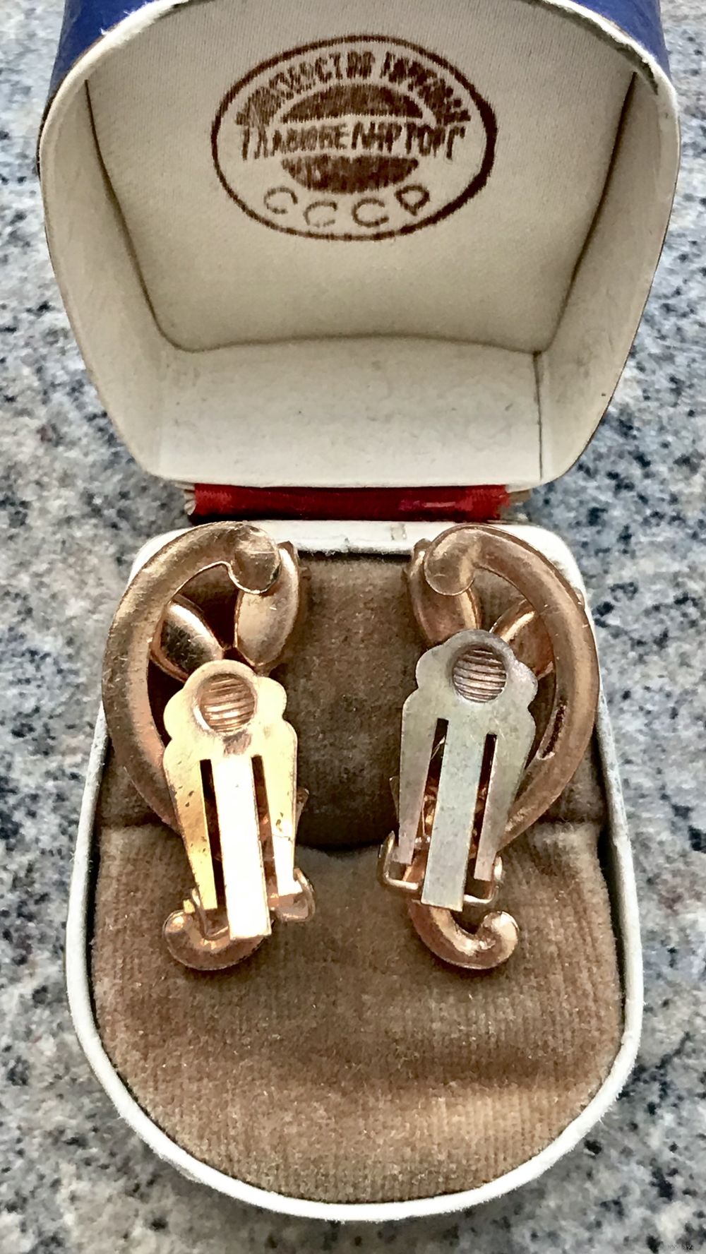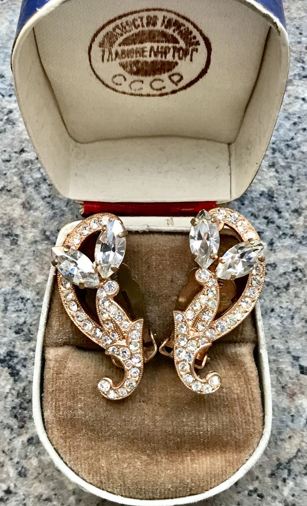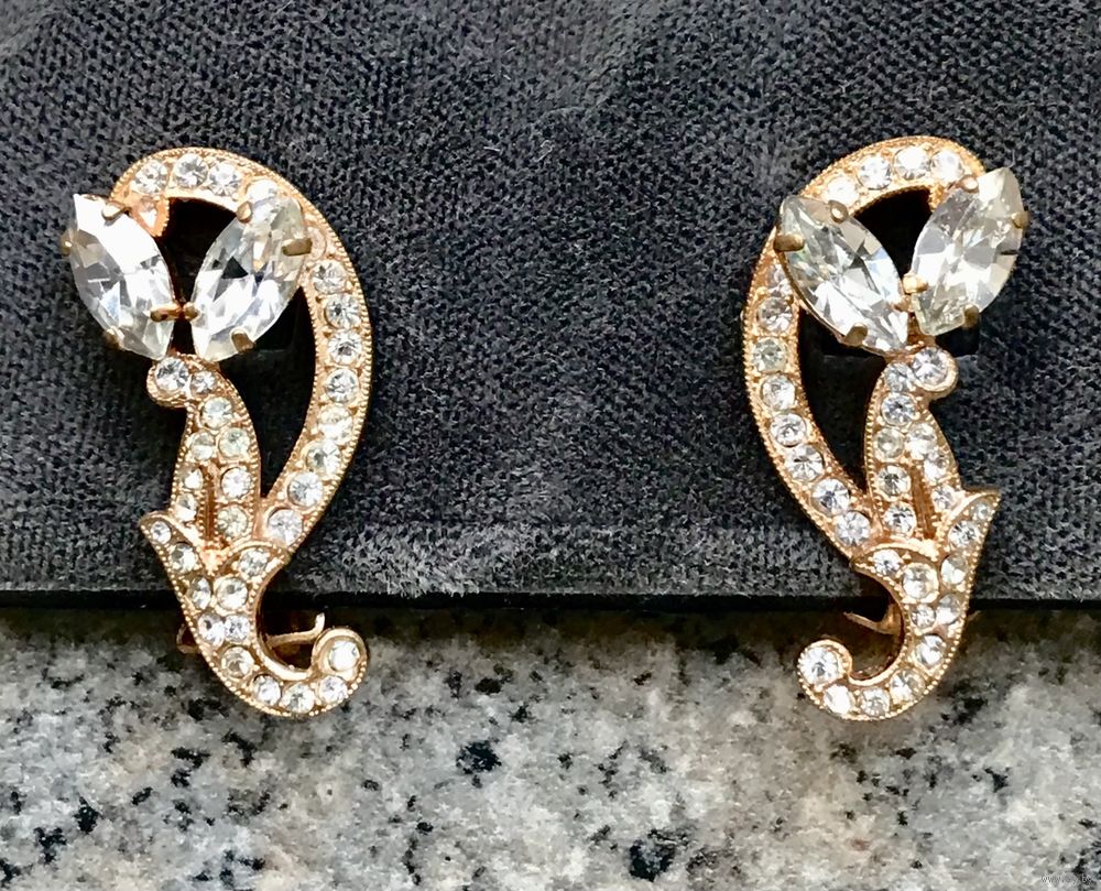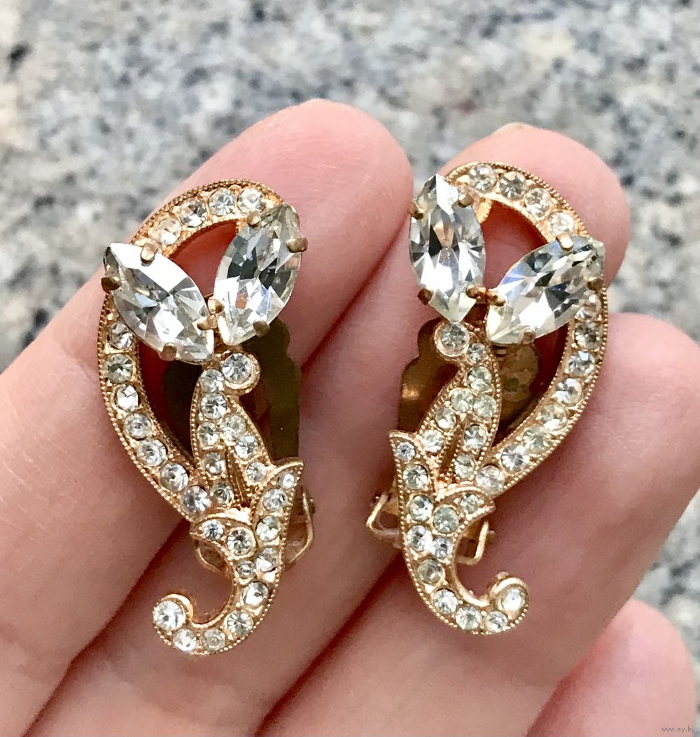 Крупные клипсы с основой из металла золотого тона, лицевая сторона украшена кристаллами разных размеров. Высота клипсы 3см., застёжки в порядке. Состояние хорошее.