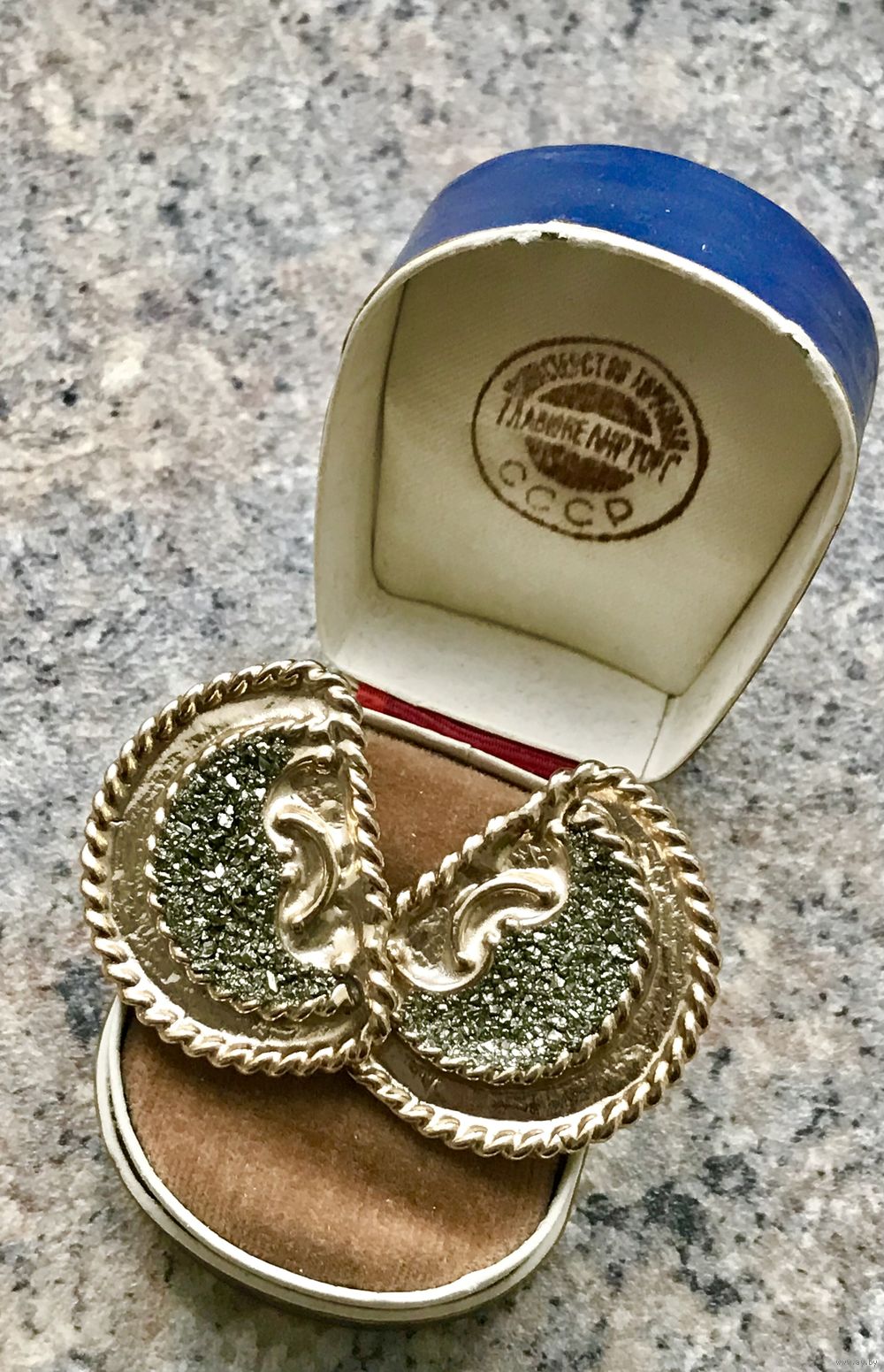 Крупные, эффектные клипсы из бижутерного сплава золотистого тона, центральная часть украшена элементом, напоминающим друзу перита серебристого цвета. Высота клипсы 3,3см., ширина 2,5см. Замочки держат надёжно. Состояние хорошее.