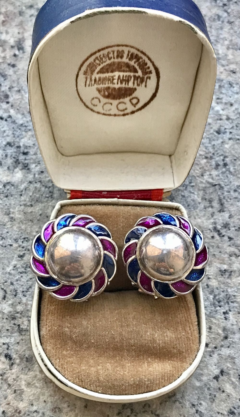 Клипсы из металла с глубоким серебрением, лицевая сторона украшена эмалью. Диаметр 2см., тяжеленькие. Замочки держат надёжно. Состояние хорошее.