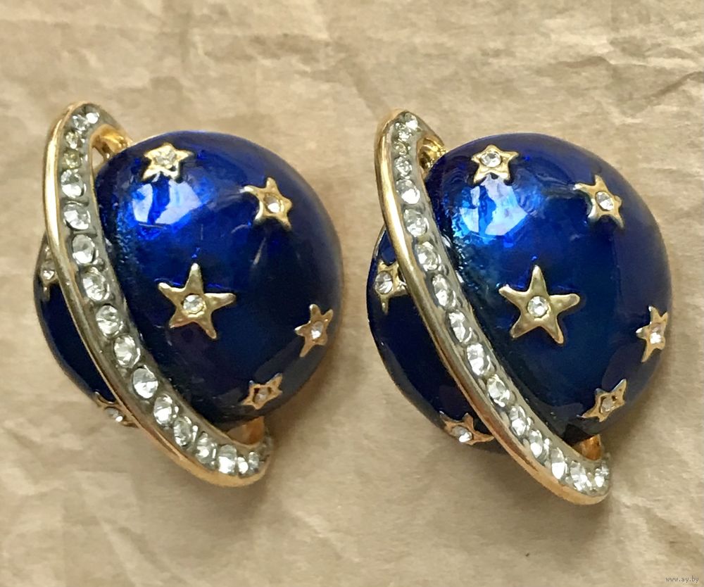 Крупные винтажные клипсы из металла золотого тона. Лицевая сторона украшена эмалью и кристаллами. Размер клипсы 2,4х3,4см. На одной клипсе стоит маркировка Royal Bijou. Тяжёленькие. Состояние хорошее.