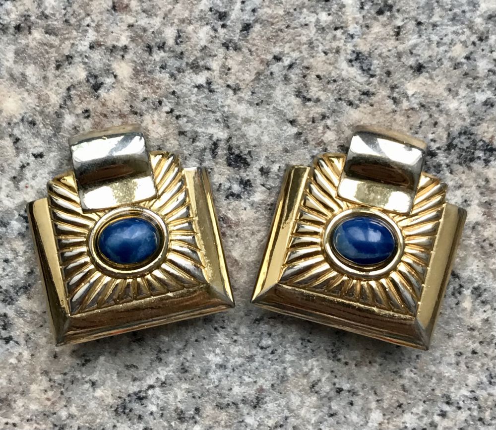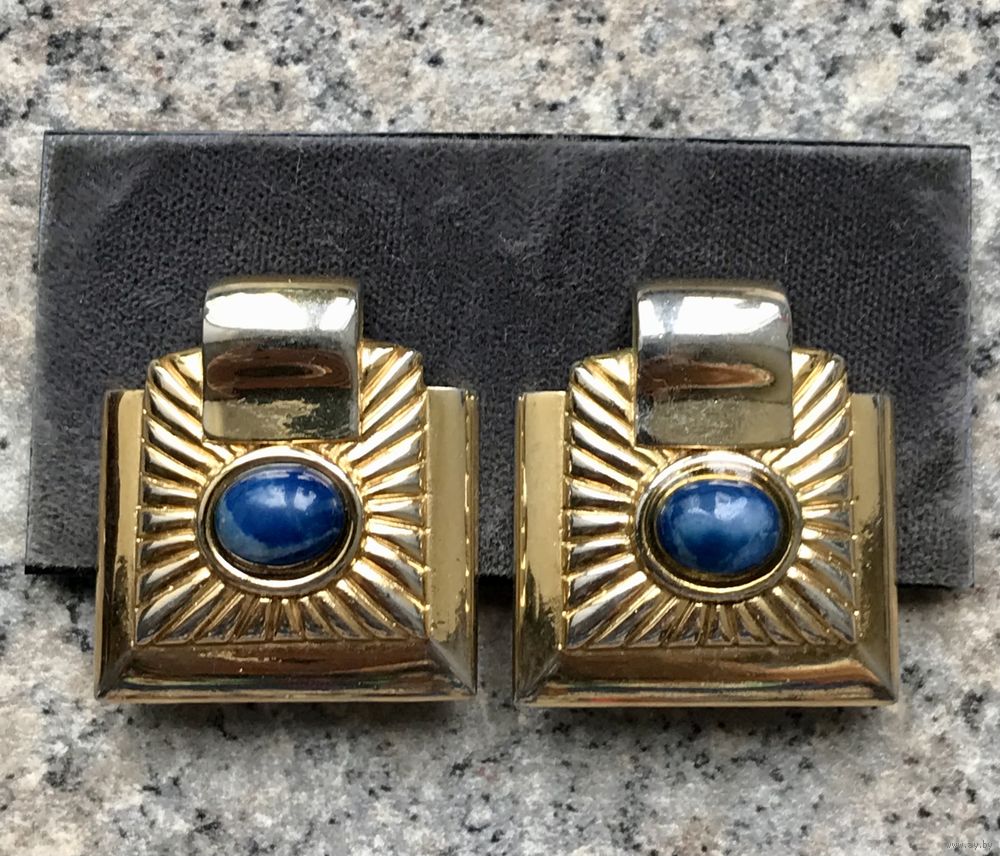 Крупные винтажные клипсы с основой из металла с позолотой. Вставка очень похожа на лазурит или содалит. Высота клипсы 3,3см., ширина 3см., размер вставки 0,9х0,8см. На лицевой стороне местами имеются потёртости позолоты, что совсем не портит внешний вид украшения. Маркированы. Тяжеленькие. Зажимы держат надёжно.