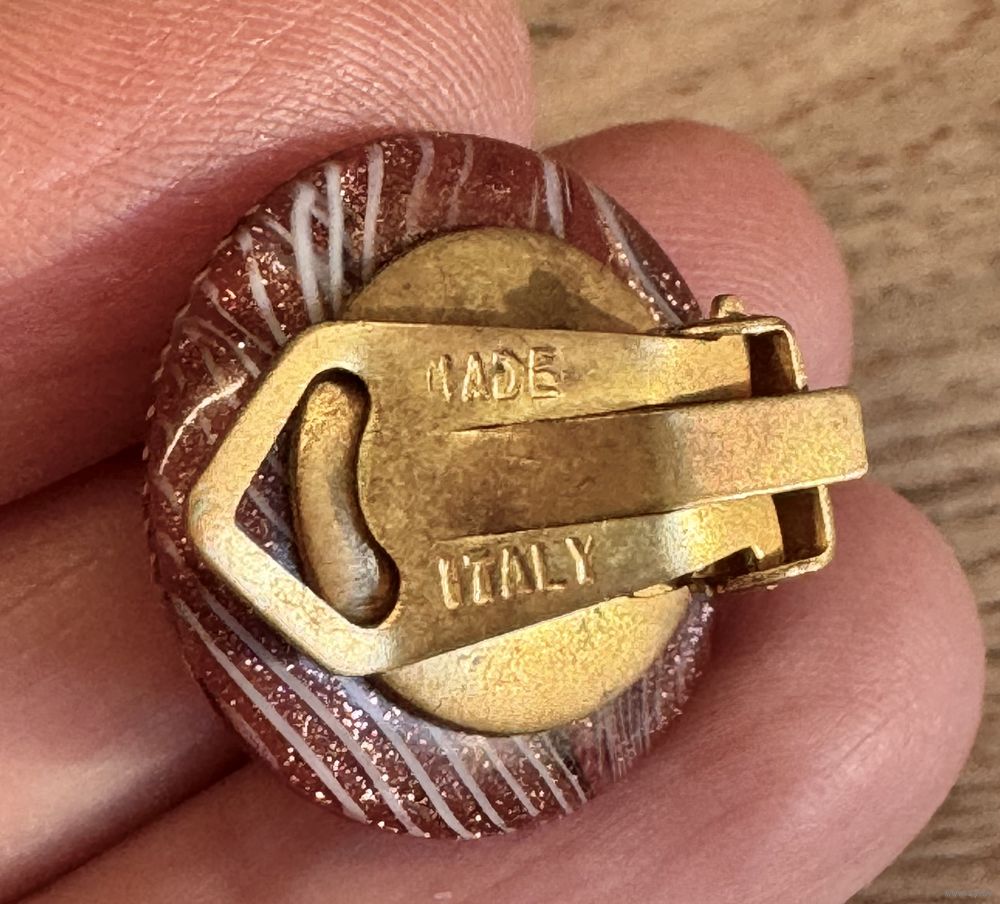 Винтажные клипсы из художественного стекла, зажимы из латуни. Сделаны в Италии. На каждом зажиме стоит отметка Made Italy. Диаметр 2см. Состояние хорошее.