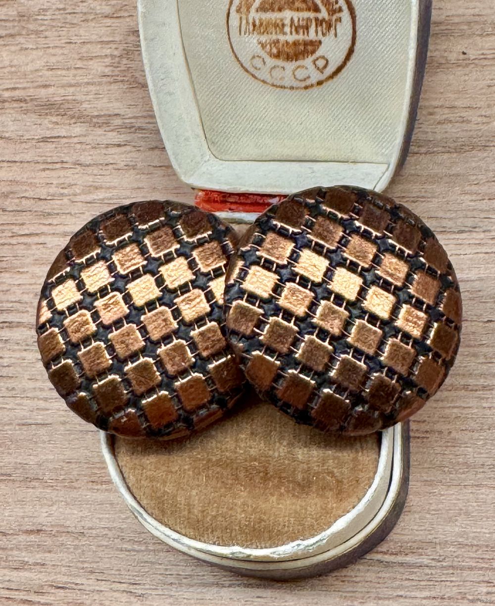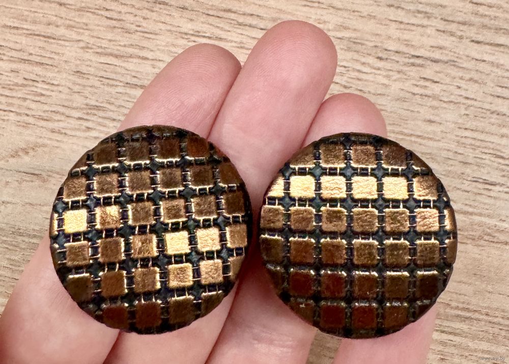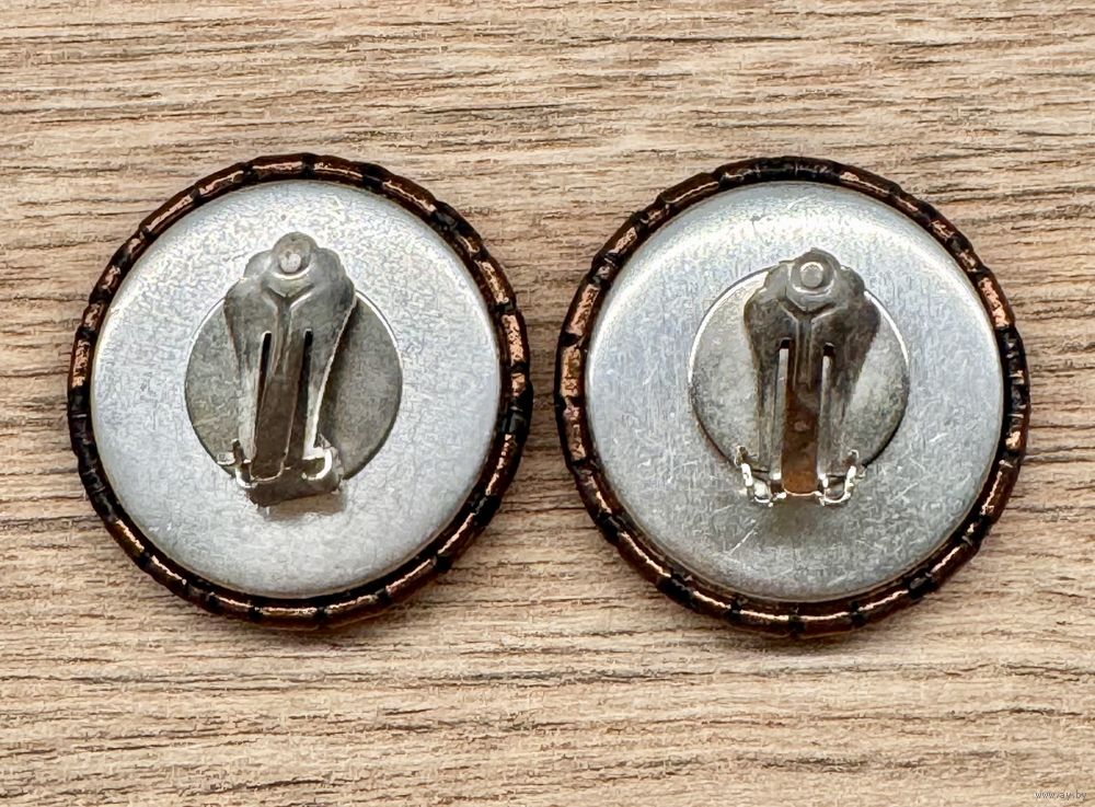Крупные винтажные клипсы, лицевая сторона обтянута тканью. Диаметр 3,3см. Легкие. Состояние хорошее.