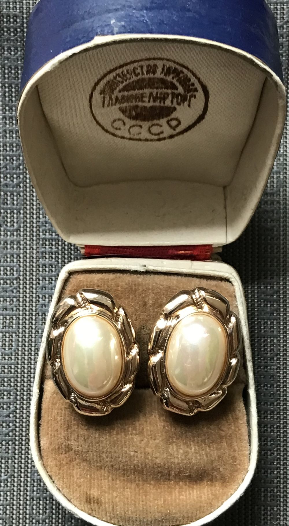 Винтажные клипсы с основой из металла золотого тона, на лицевой стороне вставки под жемчуг. Размер клипсы 2,2х2,5см., размер вставки 1,8х0,8см. Маркированы, атрибутировать не удалось. Состояние хорошее.