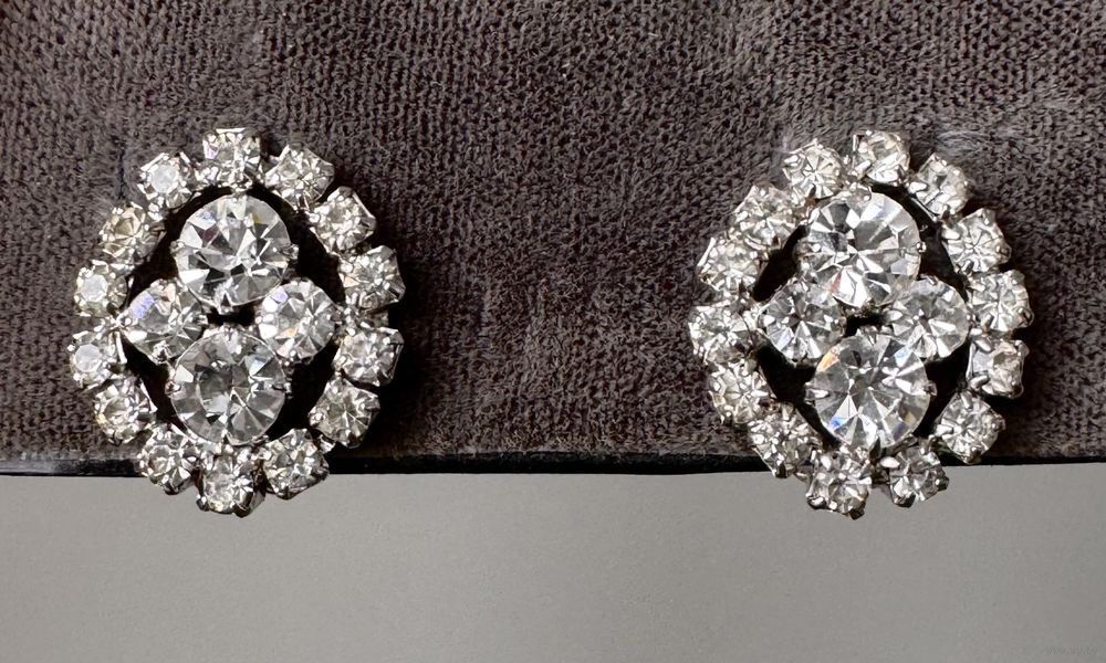 Винтажные клипсы с основой из латуни с серебрением и вставками из стекла. Размер 2,2х2см. Состояние хорошее.