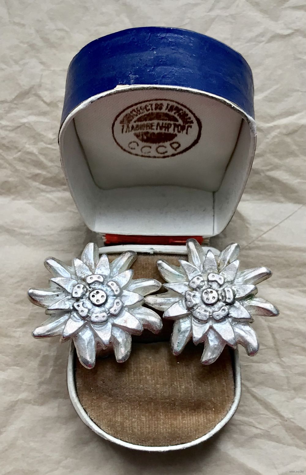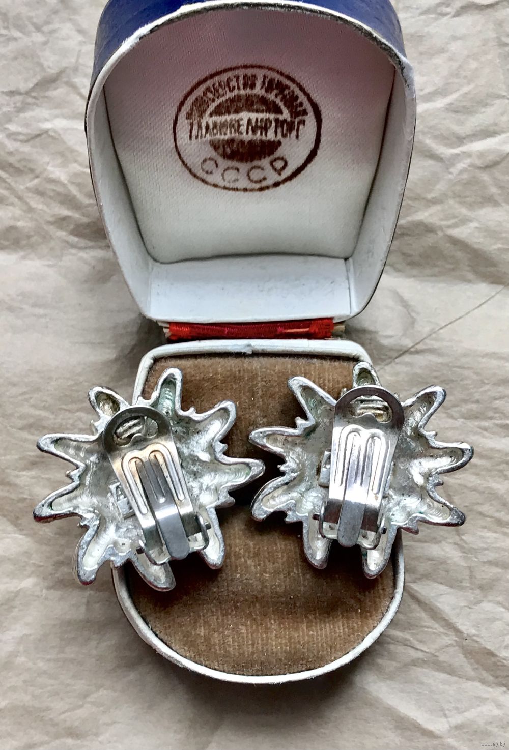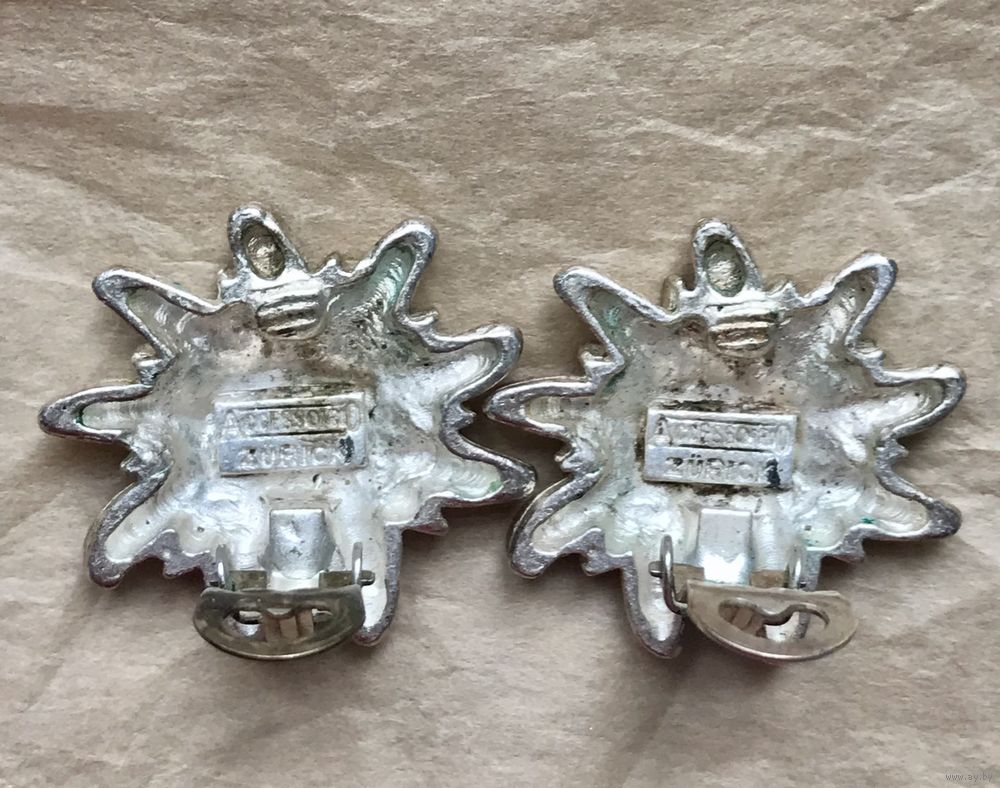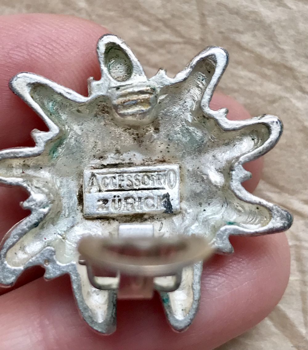 Крупные винтажные клипсы в виде цветка эдельвейса из металла цвета серебра. Диаметр 3см. На металле местами имеются небольшие потёртости. Клипсы маркированы Accessoirio Zurick.