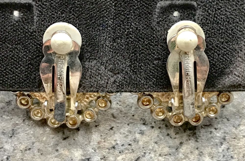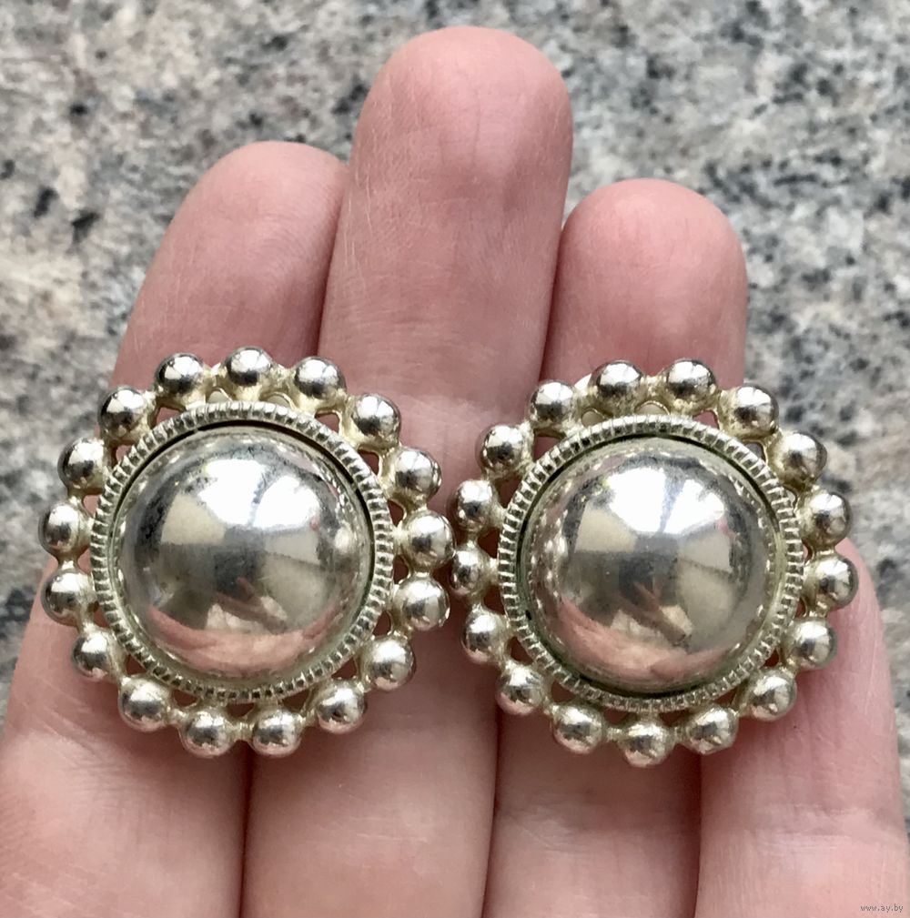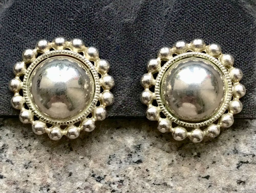 Крупные винтажные клипсы бренда Premier USA (70-е гг.) из металла серебристого тона, имеют купольную форму. Диаметр клипсы 3см., состояние хорошее. Маркированы.