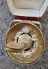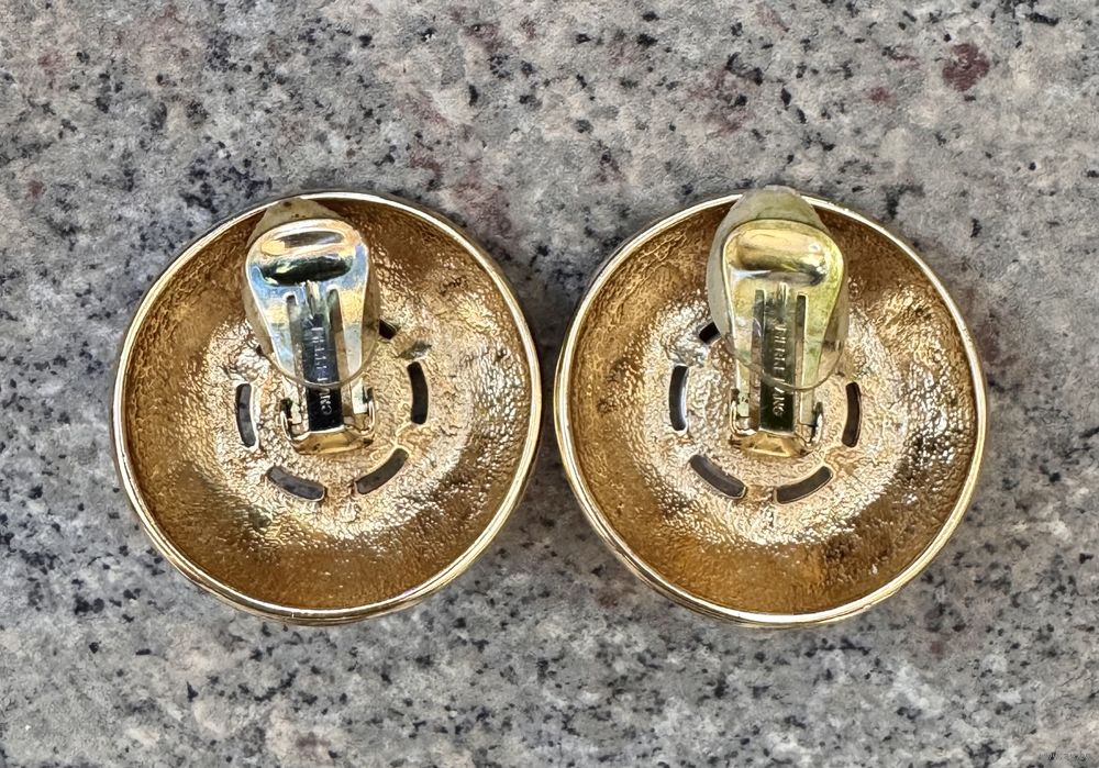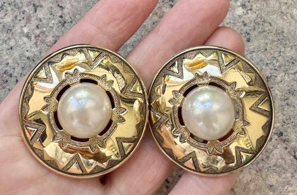 Крупные винтажные клипсы известного австрийского бренда Pierre Lang. Изготовлены из металла золотого тона, вставки под жемчуг (на вставках имеются незначительные царапки, что учтено в цене). Диаметр клипсы 4см., диаметр вставки 1,5см. Маркированы.