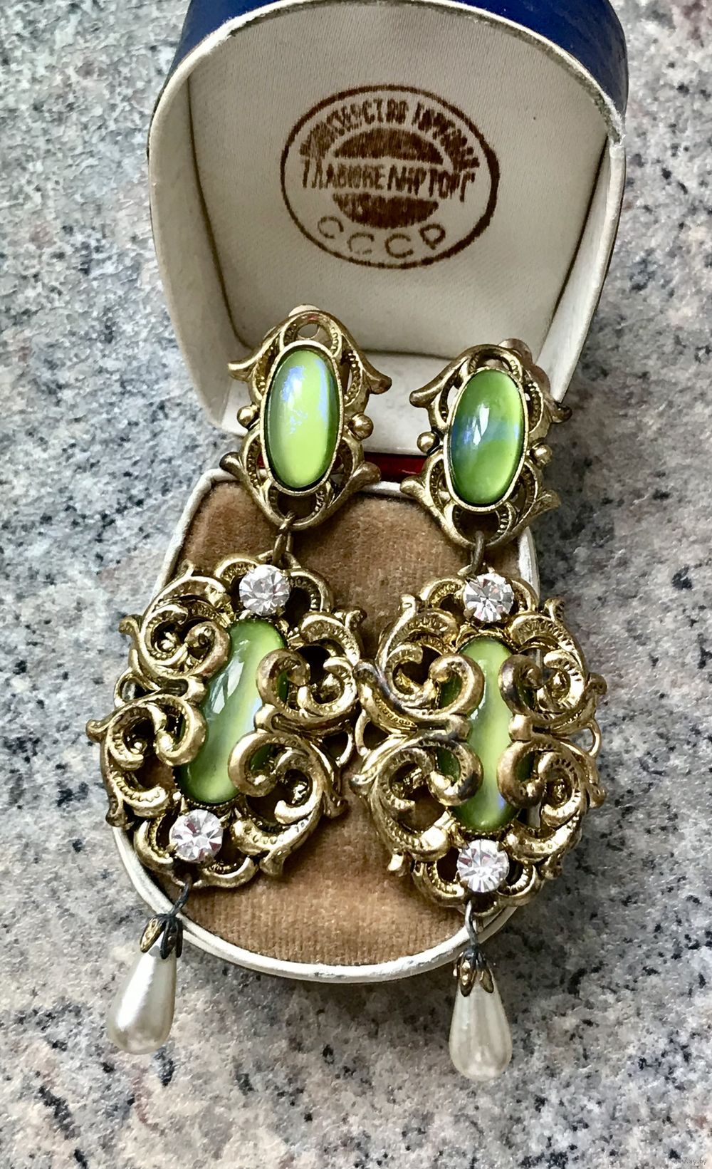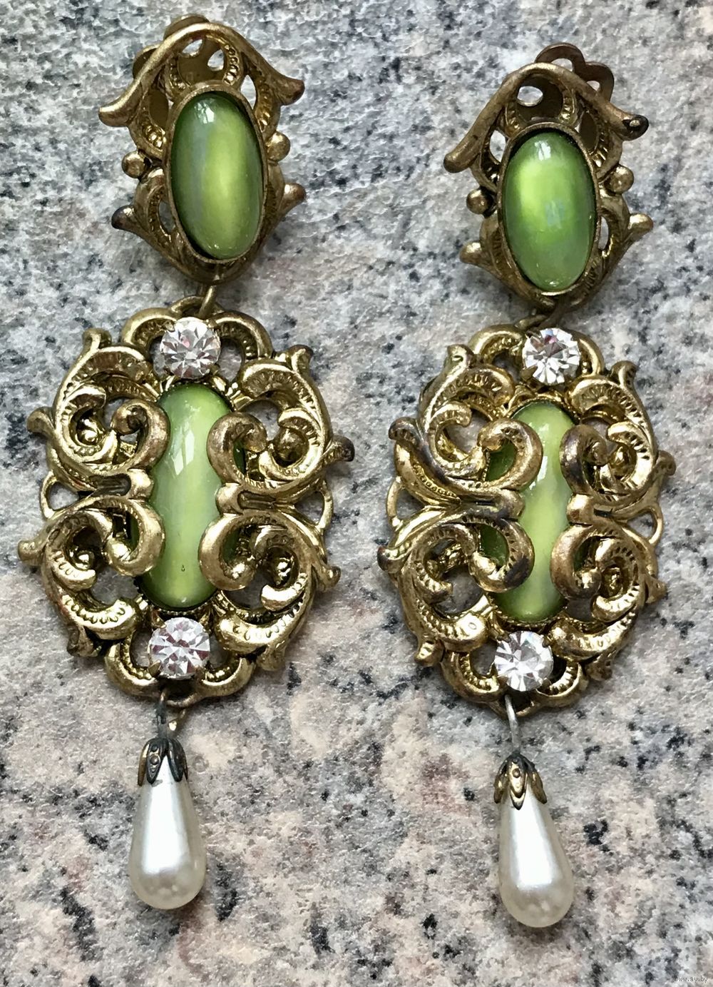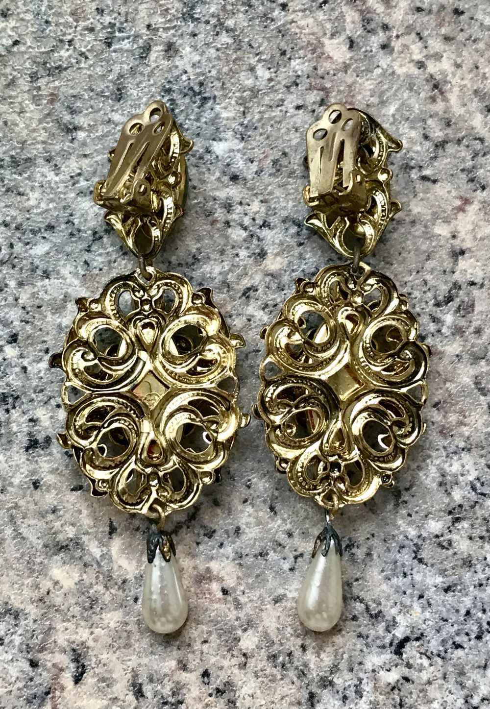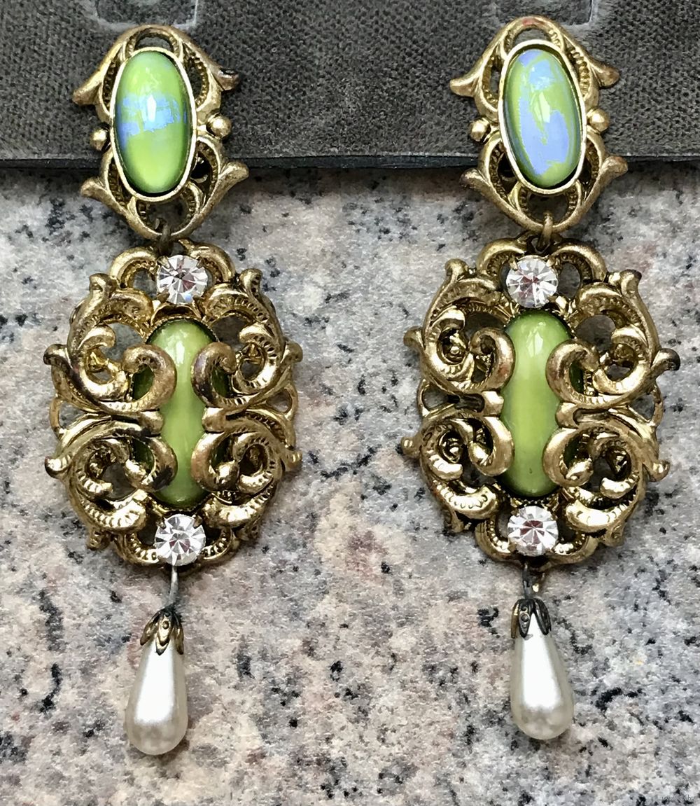 Крупные винтажные чешские клипсы с основой из латуни и вставок из художественного стекла с эффектом сапфиритов, ювелирного стекла и бусин под жемчуг. На металле с лицевой стороны имеются местами потемнения на металле (этот нюанс учтён в цене). Высота клипсы 7,3см.