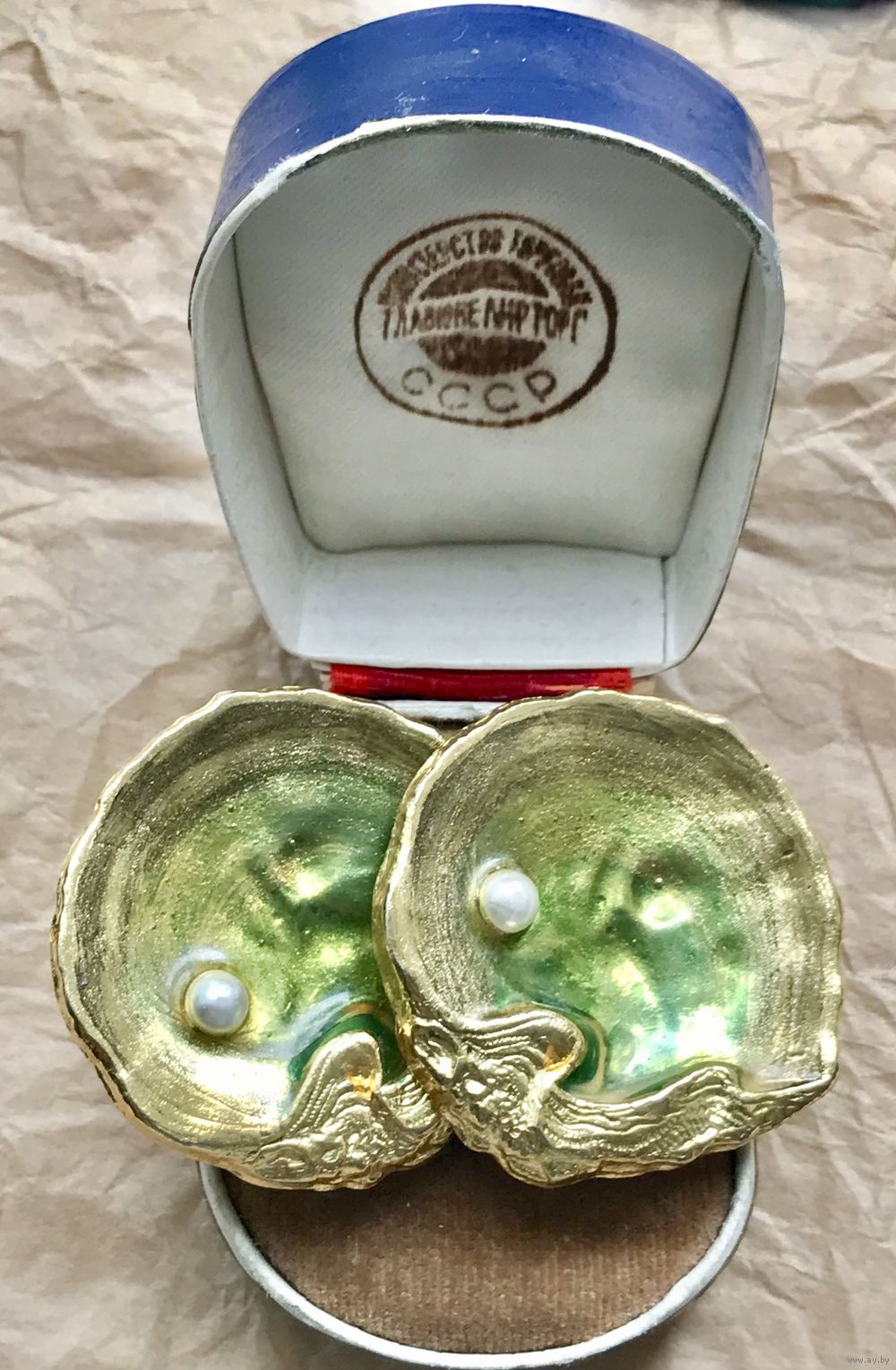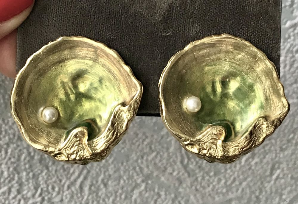 Крупные эффектные винтажные клипсы с основой из металла золотого тона, лицевая сторона украшена эмалью и небольшой бусиной под жемчуг (на обеих бусинах есть небольшой сход покрытия, в носке не заметно). Диаметр клипсы 3,7см. Клипсы хоть и крупные, но не тяжёлые.