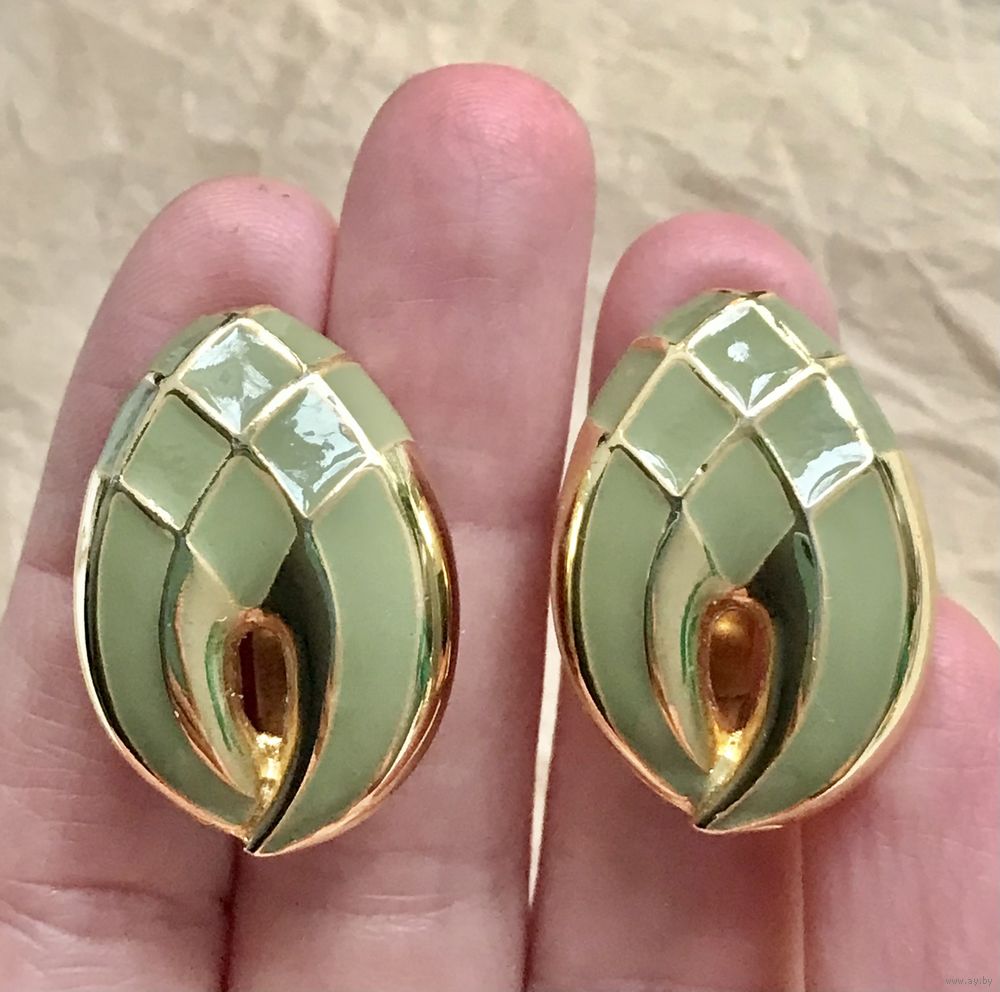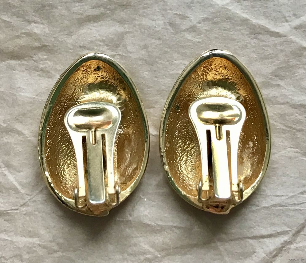 Крупные винтажные клипсы из металла золотого тона. Лицевая сторона украшена эмалью. Размер клипсы 3х2см. Тяжёленькие. Состояние хорошее.