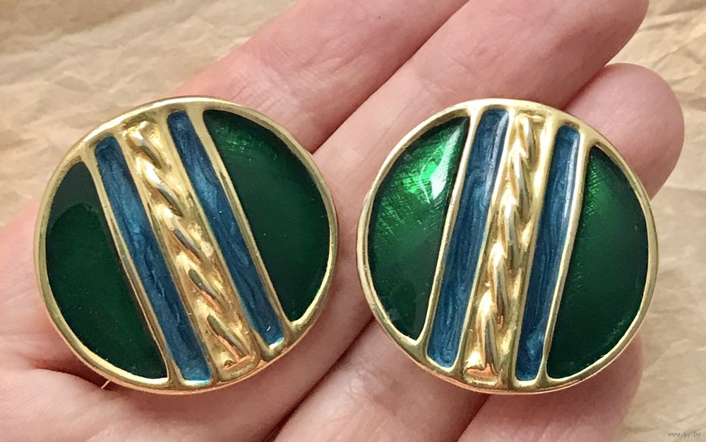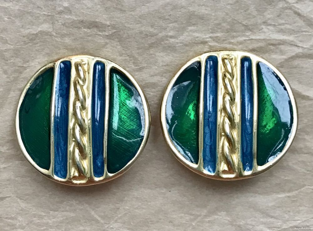 Крупные винтажные клипсы с основой из металла золотого тона, лицевая сторона украшена яркими эмалями. Диаметр клипсы 3,2см. Тяжёленькие. Состояние хорошее.