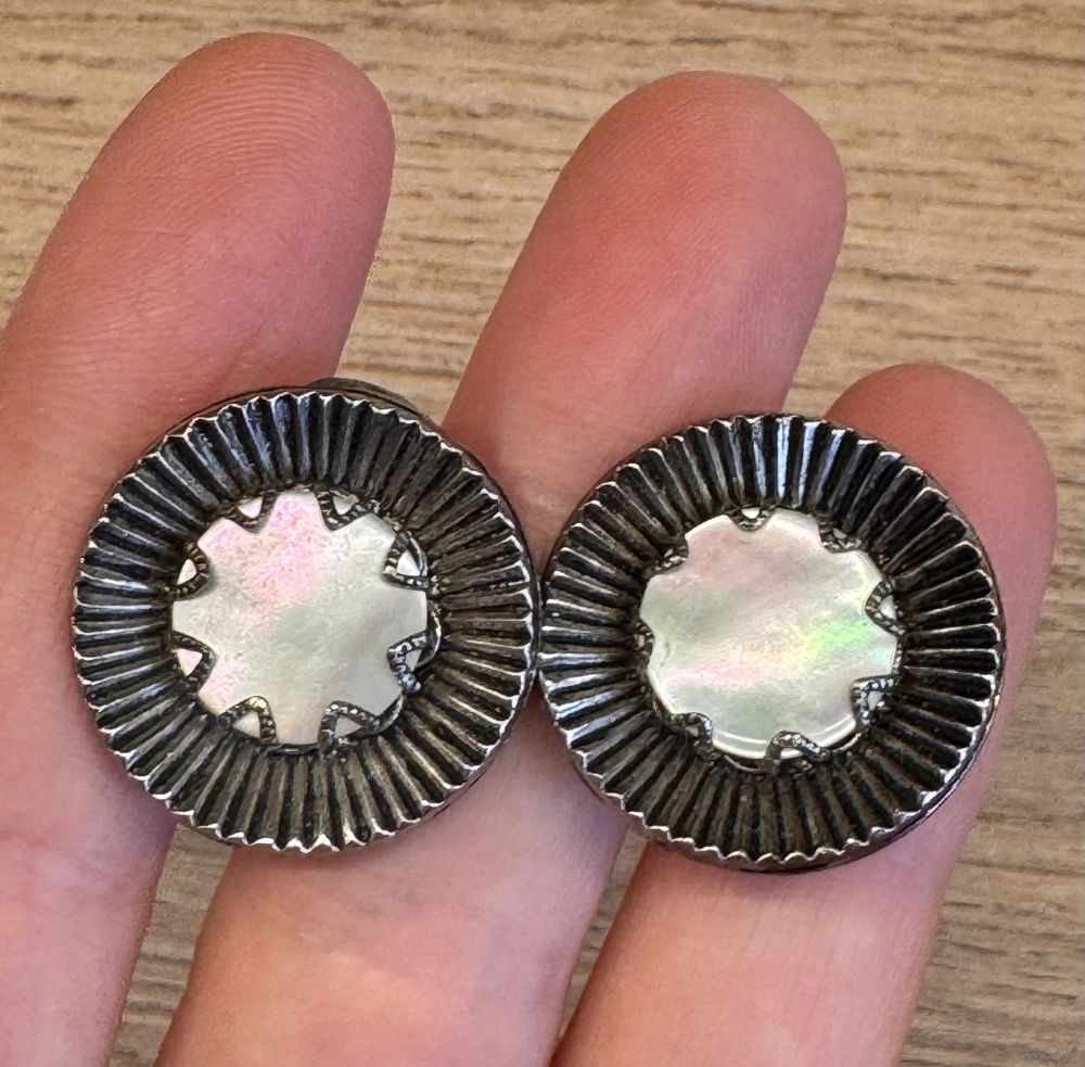 Винтажные клипсы из металла серебристого тона, на лицевой стороне вставка из перламутра. Диаметр клипсы 2,2см. Легкие. Состояние хорошее.