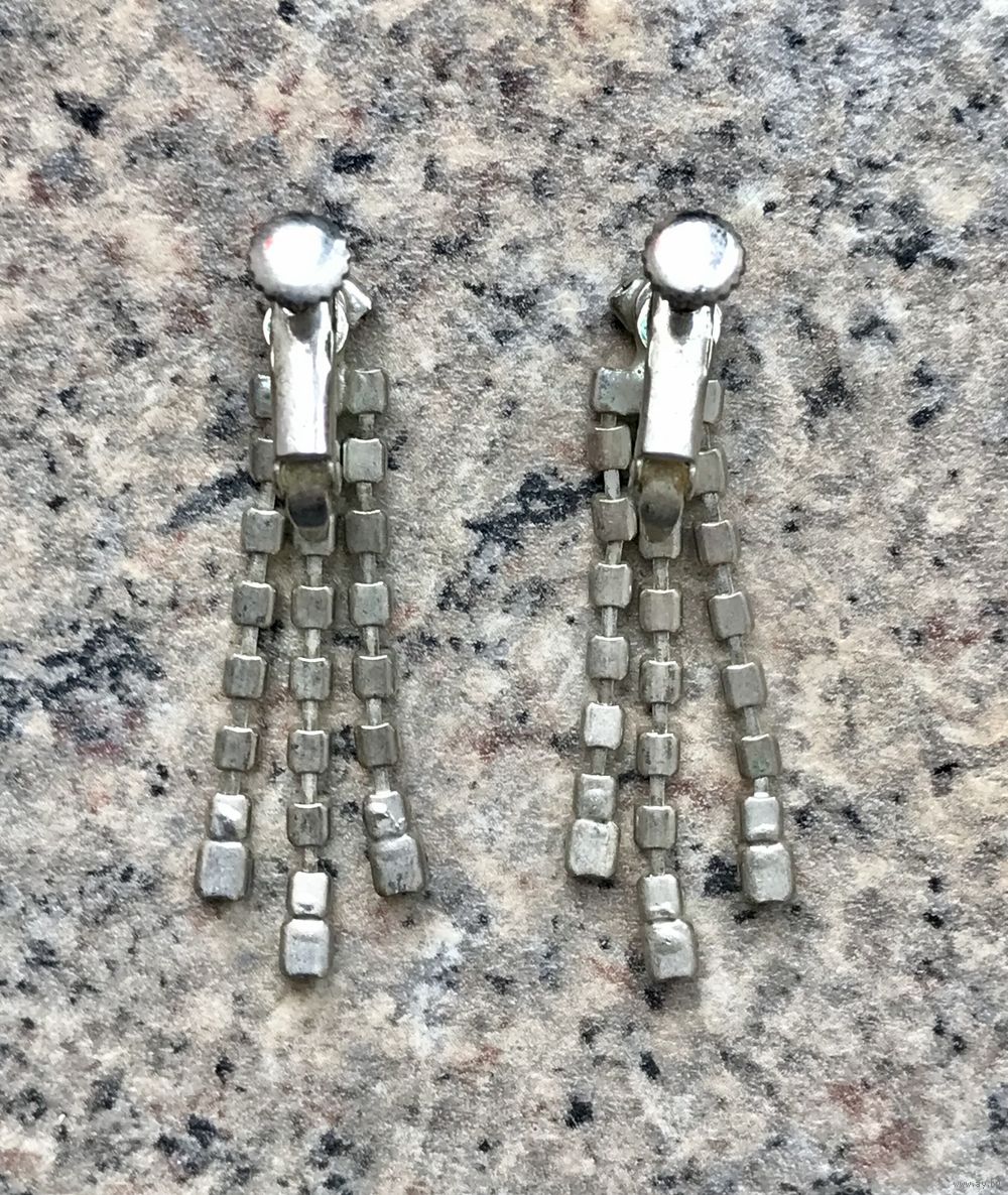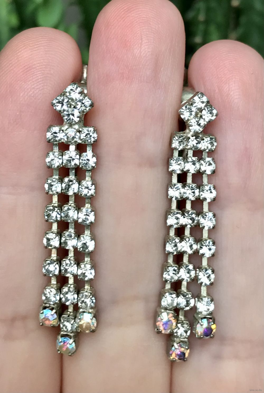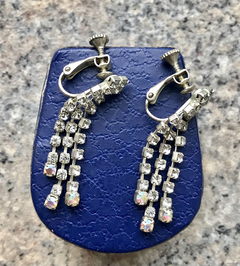 Винтажные клипсы на винтах. Вставки из стекла, внизу каждой висюльки по кристаллу с покрытием AB. Высота серьги 4см., состояние хорошее.