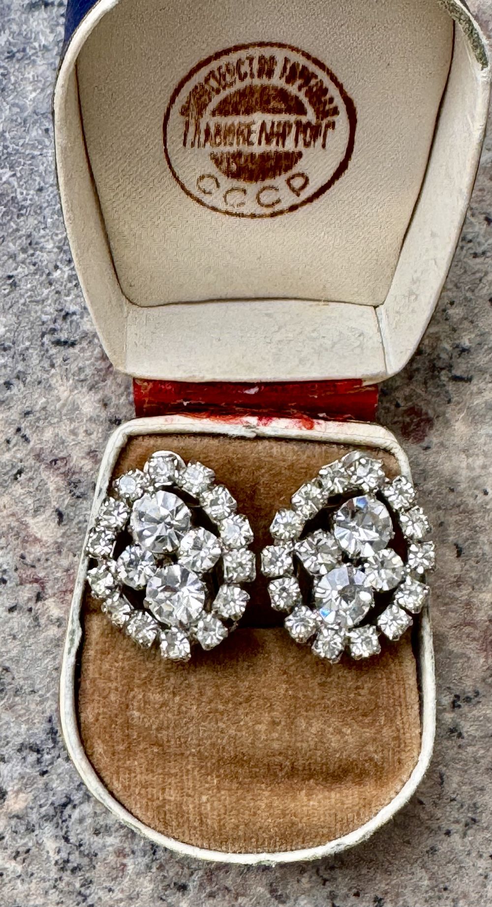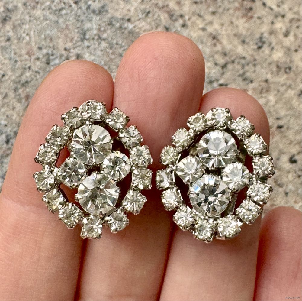 Винтажные клипсы с основой из латуни с серебрением и вставками из стекла. Размер 2,2х2см. Состояние хорошее.