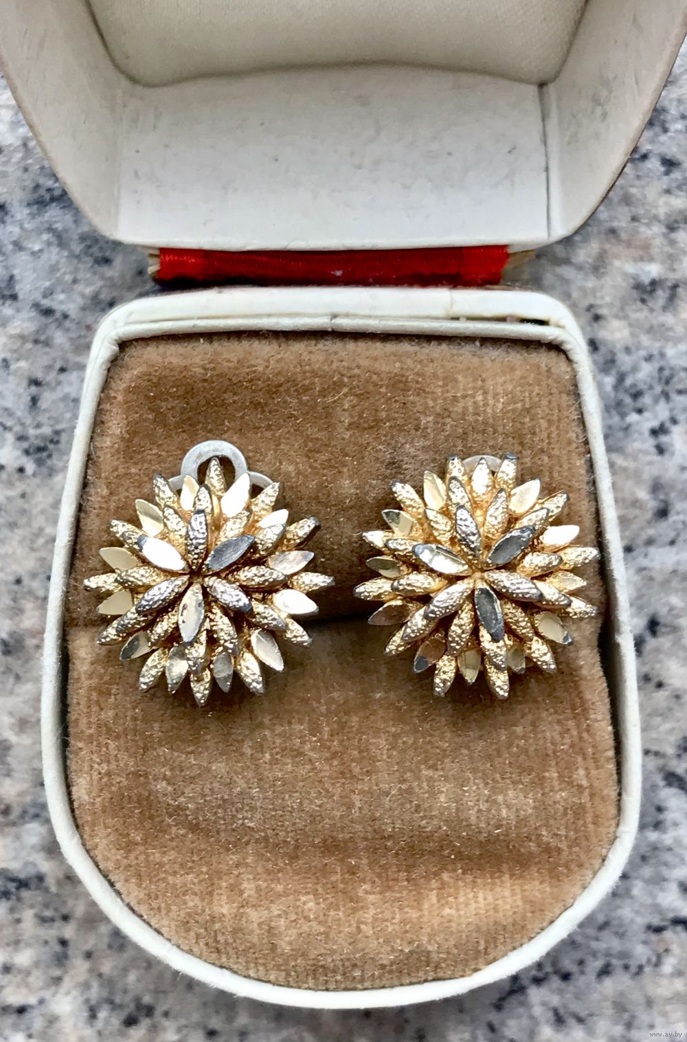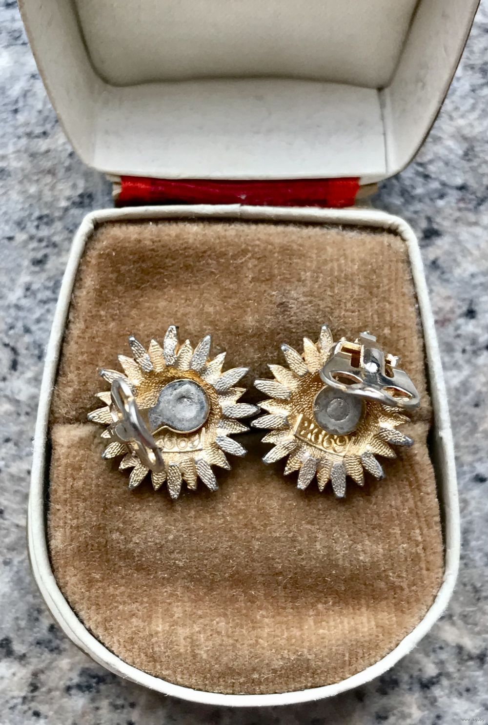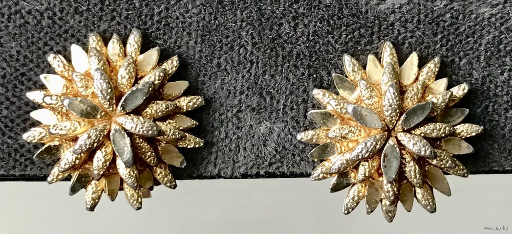 Небольшие винтажные клипсы английского бренда Sphinx из металла золотистого тона, на лицевой стороне имеются потёртости позолоты (учтено в цене). Диаметр клипсы 1,6см., маркированы номером.