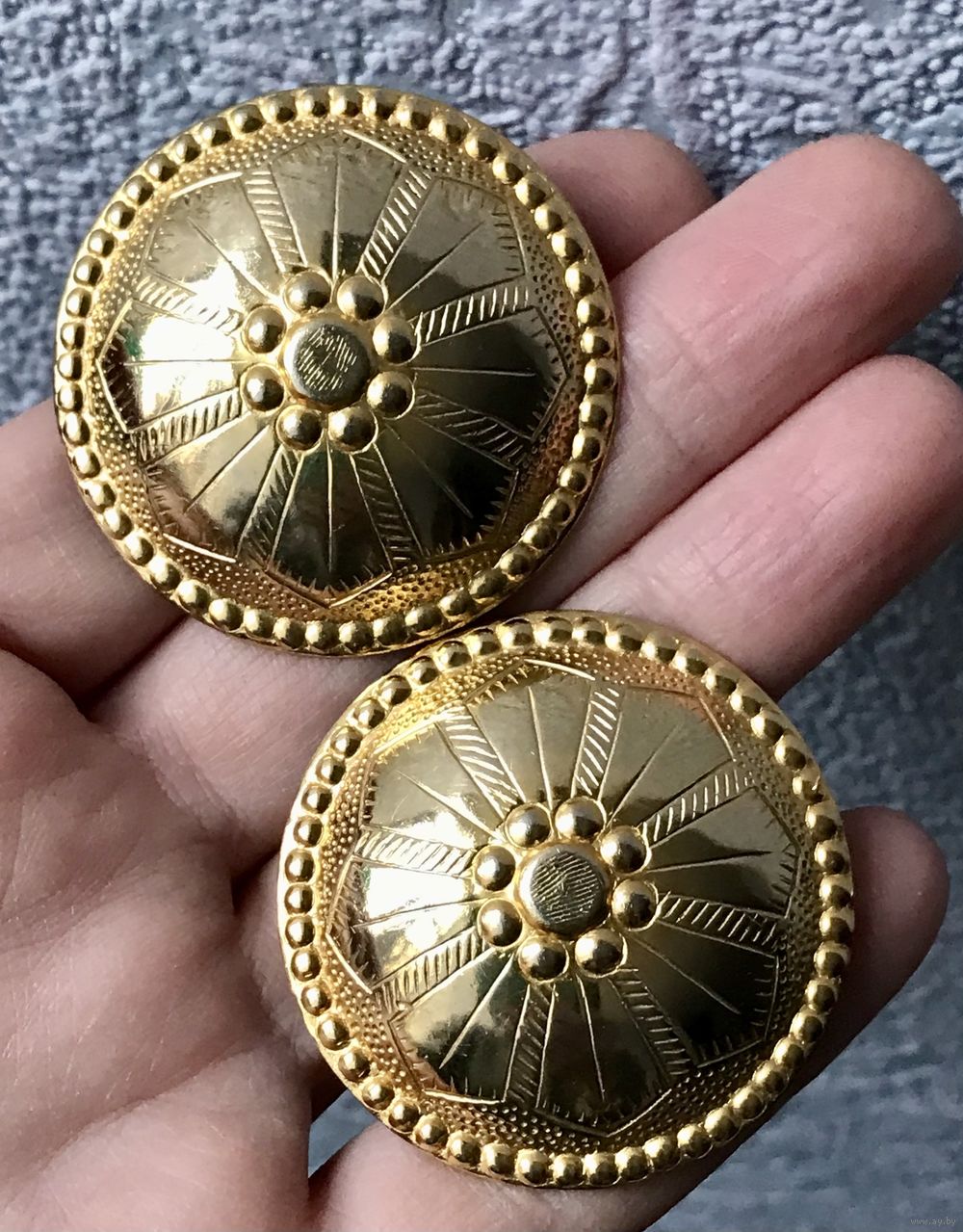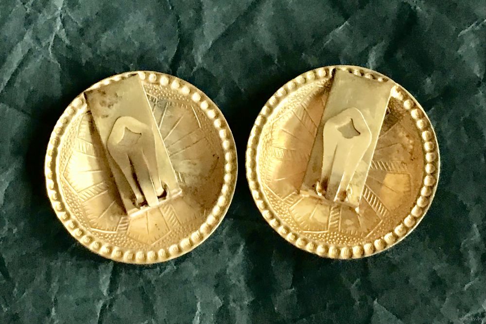Крупные винтажные клипсы из металла золотого тона, диаметр 4,3см. Клипсы хоть и крупные, но не тяжёлые. Состояние хорошее.