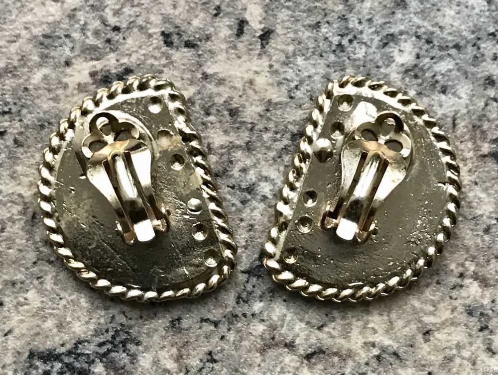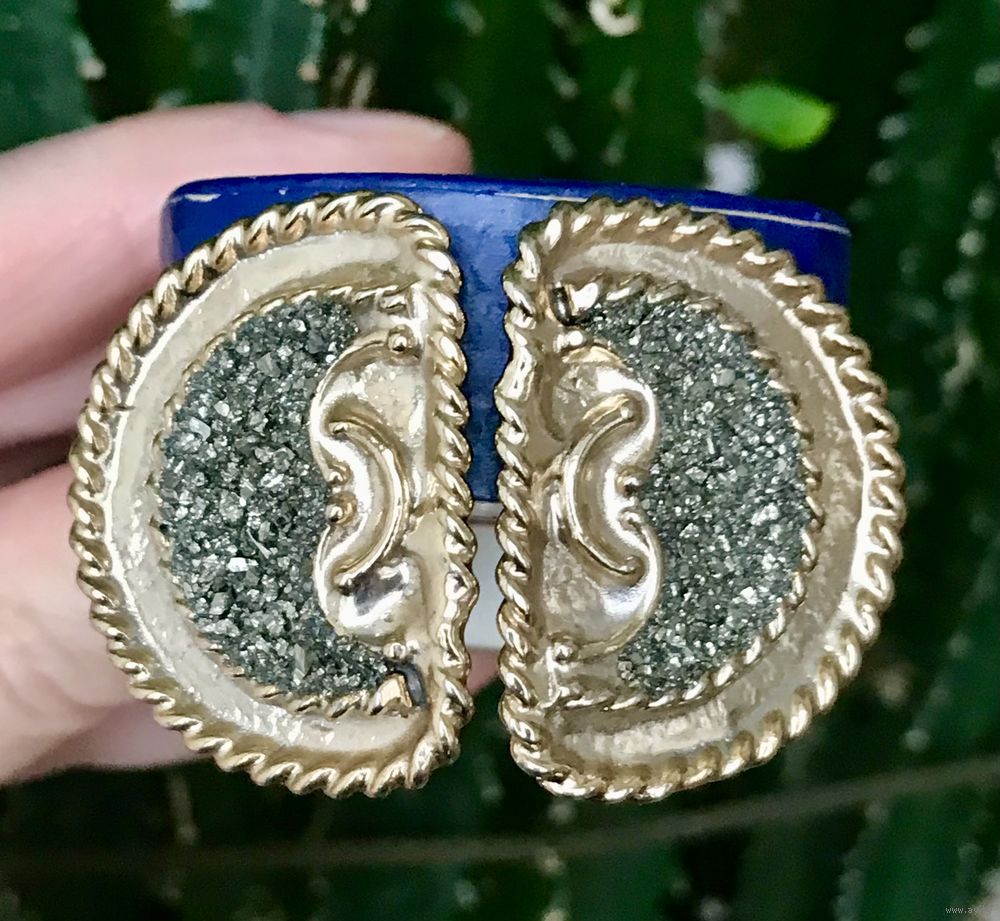 Крупные, эффектные клипсы из бижутерного сплава золотистого тона, центральная часть украшена элементом, напоминающим друзу перита серебристого цвета. Высота клипсы 3,3см., ширина 2,5см. Замочки держат надёжно. Состояние хорошее.