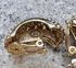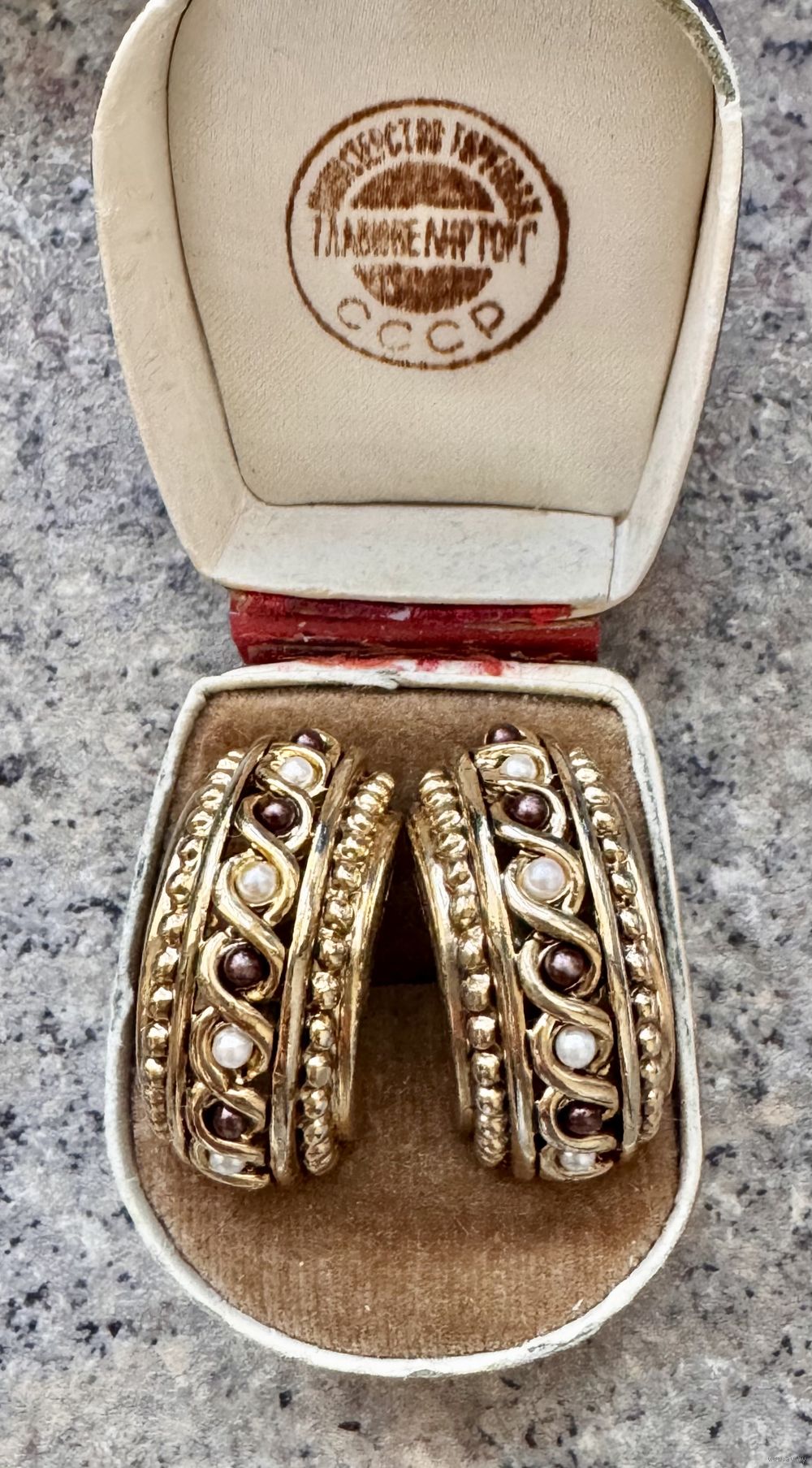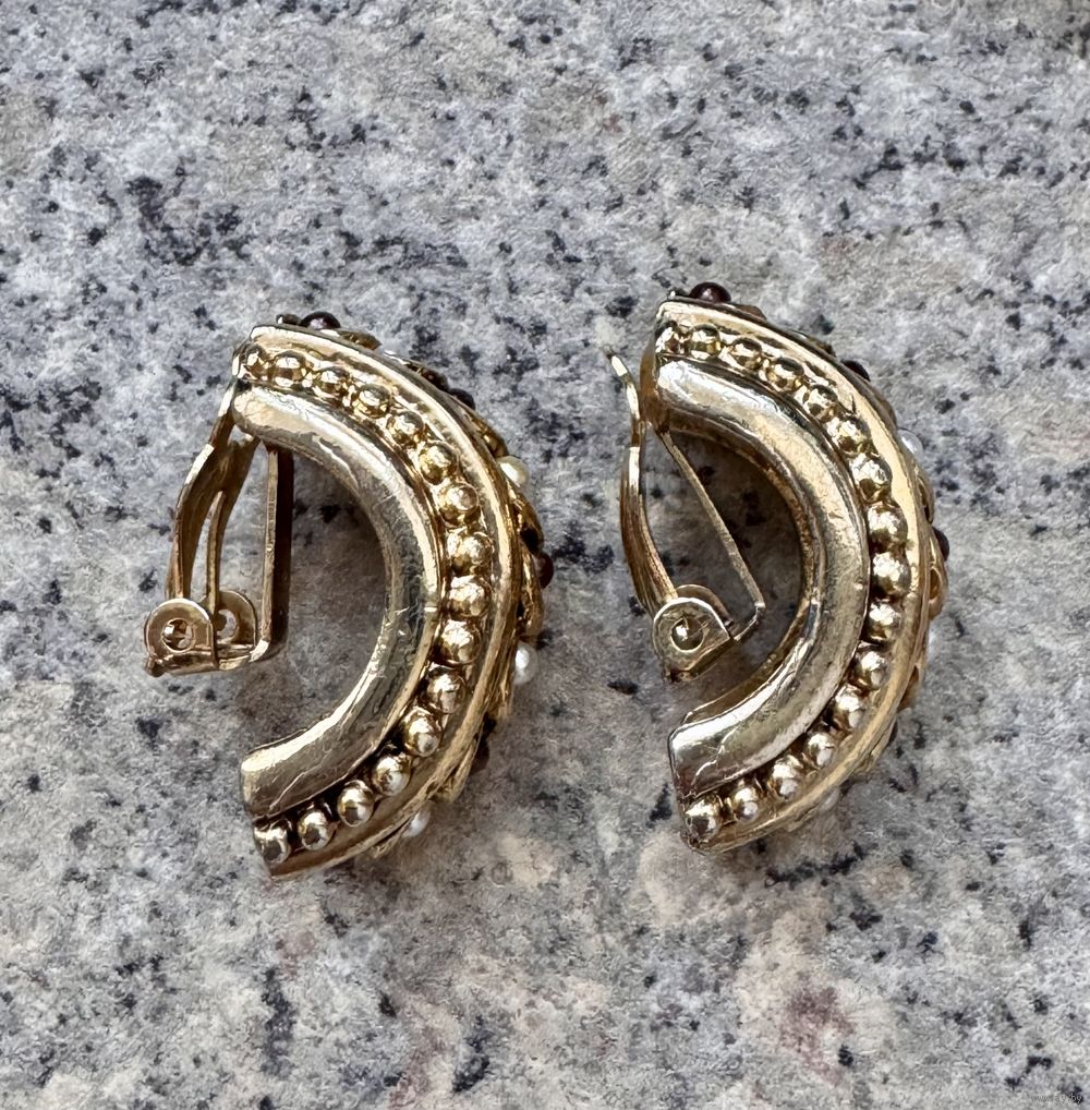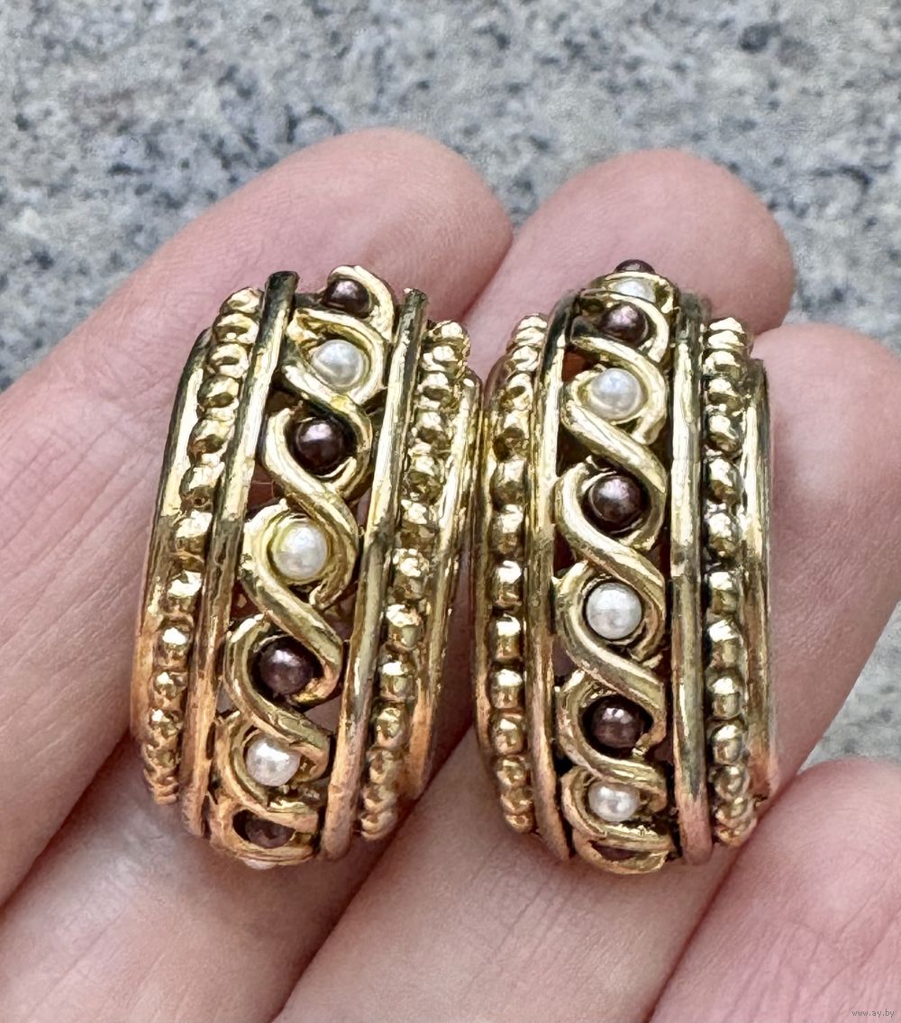 Крупные винтажные клипсы из металла золотого тона, лицевая сторона украшена искусственным жемчугом двух оттенков: классического белого и насыщенного темно-коричневого. Размер клипсы 3х1,4см. Маркированы. Состояние хорошее.