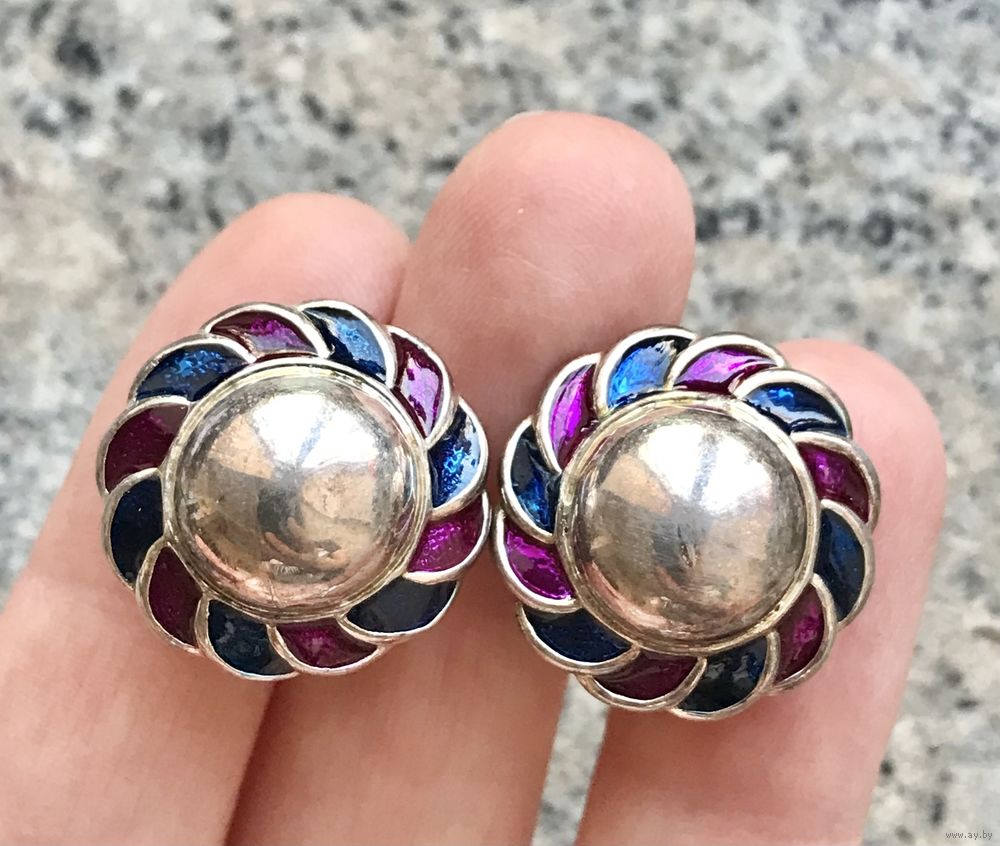 Клипсы из металла с глубоким серебрением, лицевая сторона украшена эмалью. Диаметр 2см., тяжеленькие. Замочки держат надёжно. Состояние хорошее.