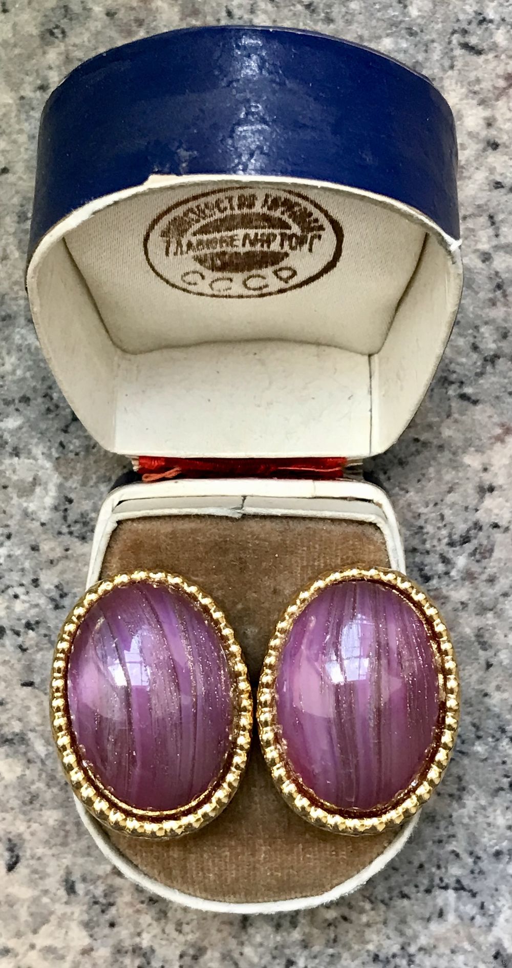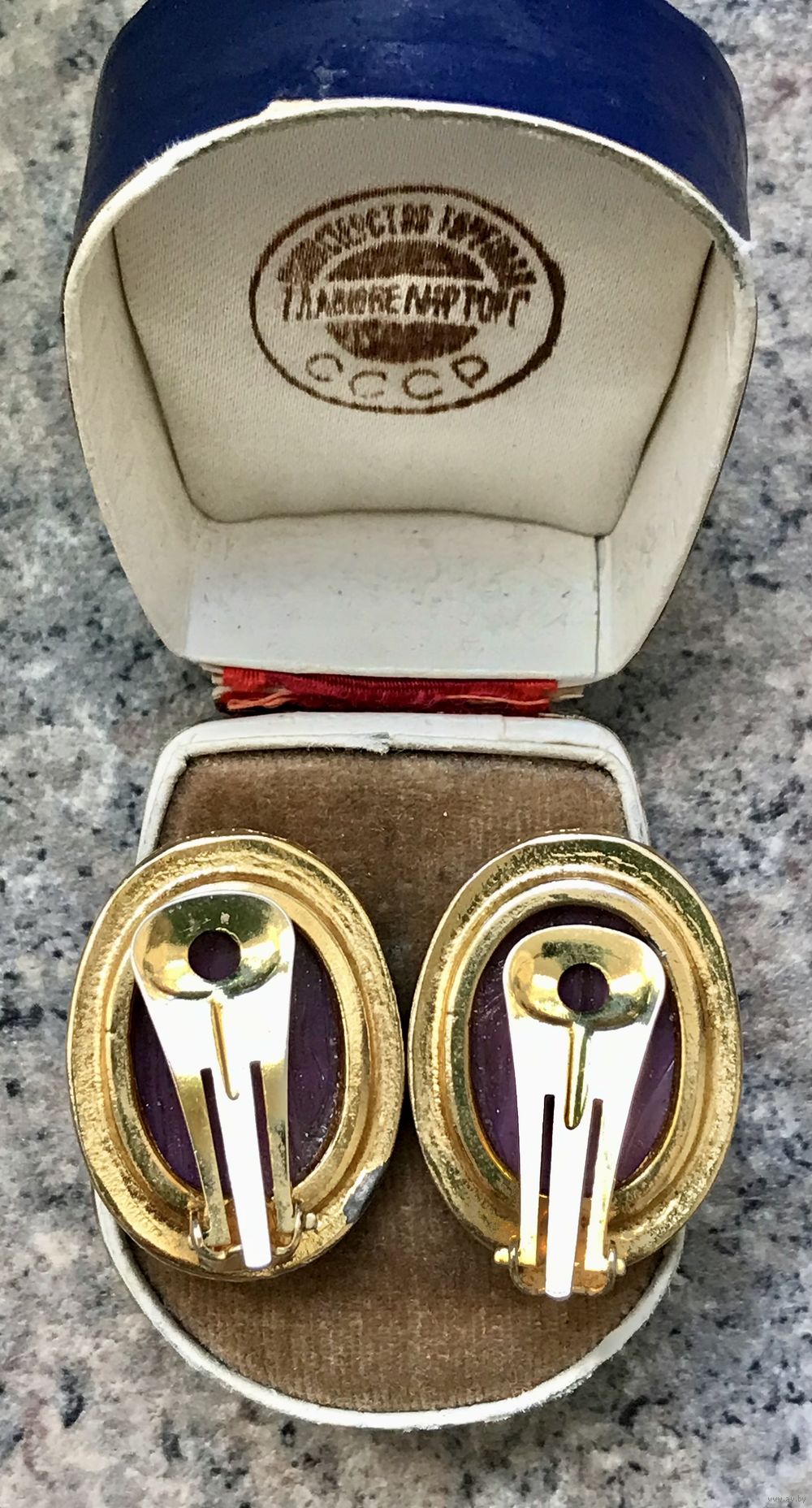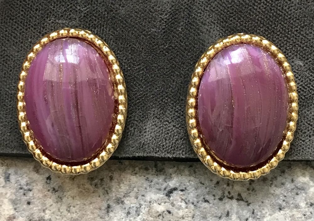 Крупные эффектные винтажные клипсы с основой из бижутерного сплава с покрытием золотого тона, лицевая сторона украшена вставками из художественного стекла. На одной клипсе с обратной стороны есть небольшой скол покрытия на металле. Размер клипс 3х2,2см., размер вставок 2,5х1,8см. Имеют приятный вес.