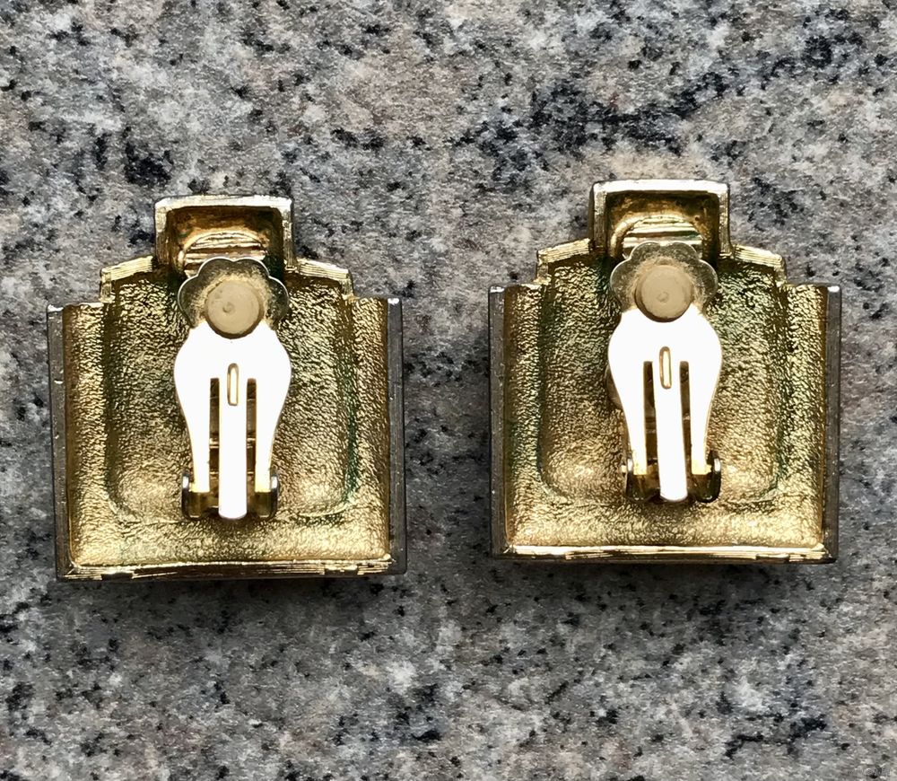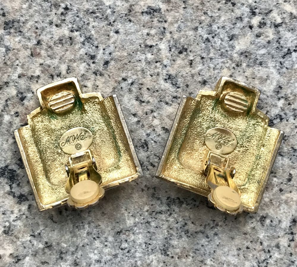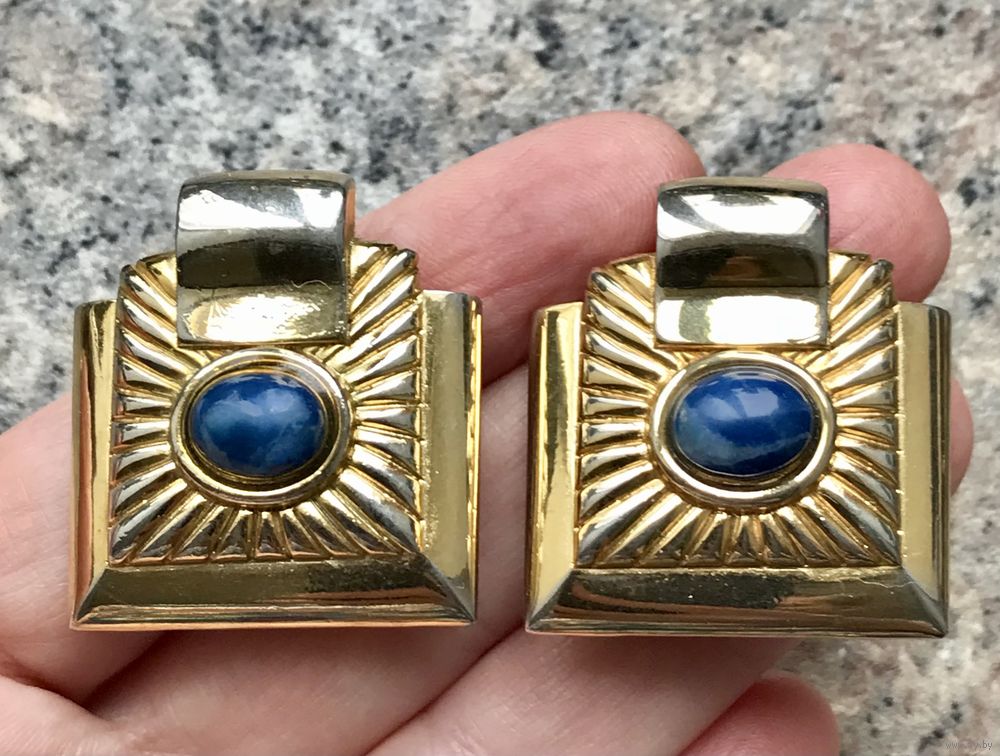 Крупные винтажные клипсы с основой из металла с позолотой. Вставка очень похожа на лазурит или содалит. Высота клипсы 3,3см., ширина 3см., размер вставки 0,9х0,8см. На лицевой стороне местами имеются потёртости позолоты, что совсем не портит внешний вид украшения. Маркированы. Тяжеленькие. Зажимы держат надёжно.