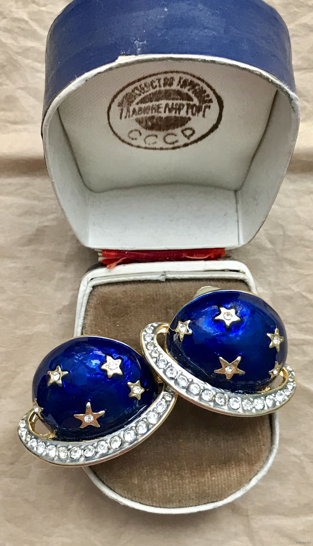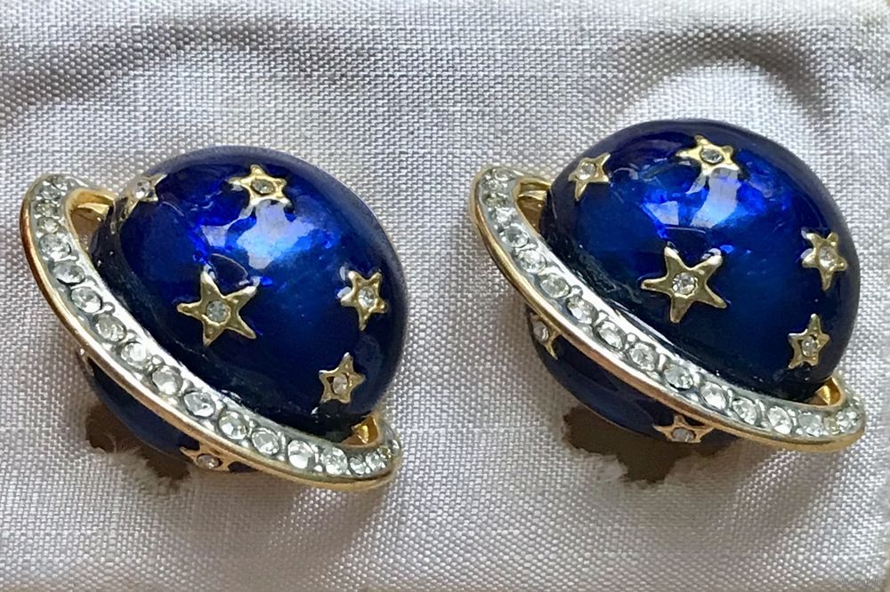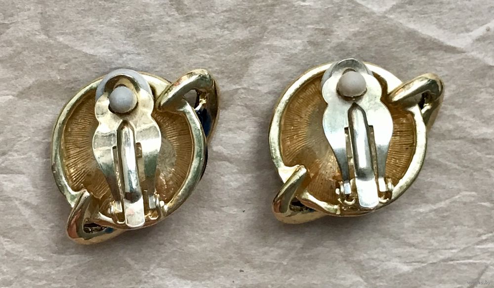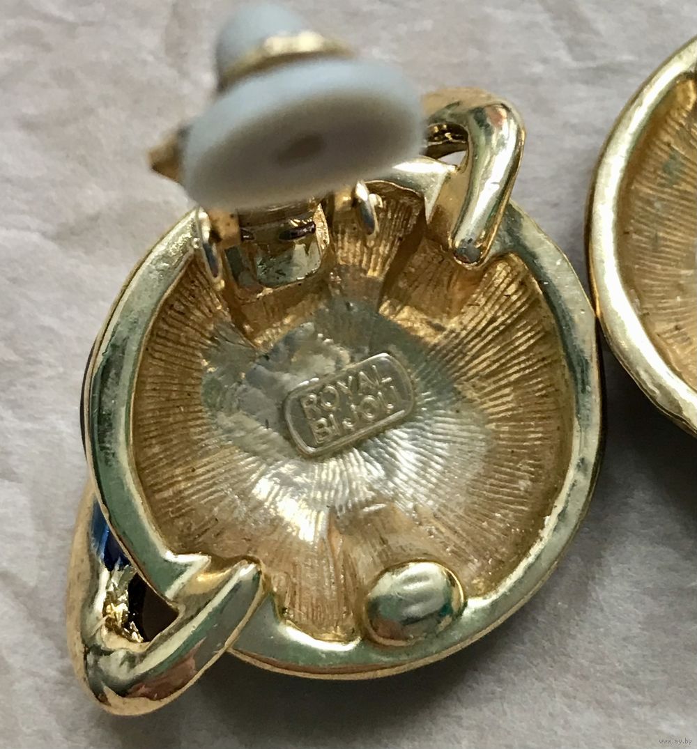 Крупные винтажные клипсы из металла золотого тона. Лицевая сторона украшена эмалью и кристаллами. Размер клипсы 2,4х3,4см. На одной клипсе стоит маркировка Royal Bijou. Тяжёленькие. Состояние хорошее.