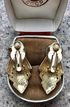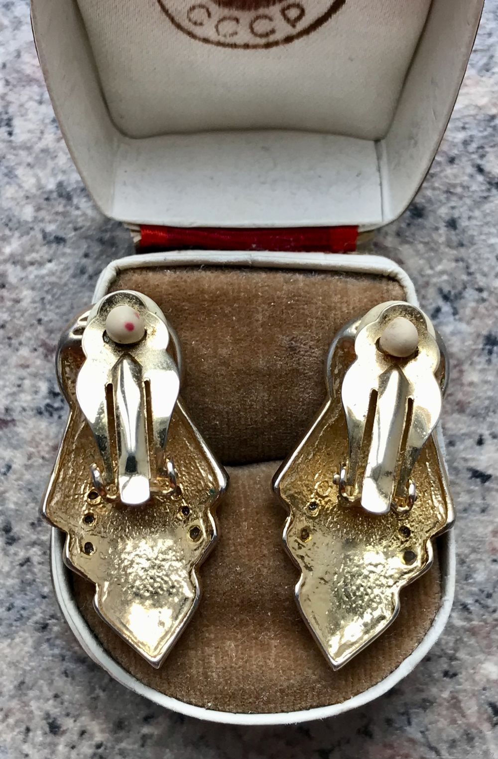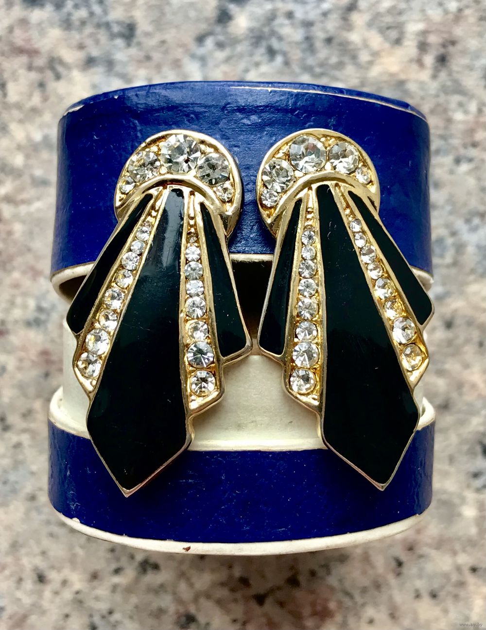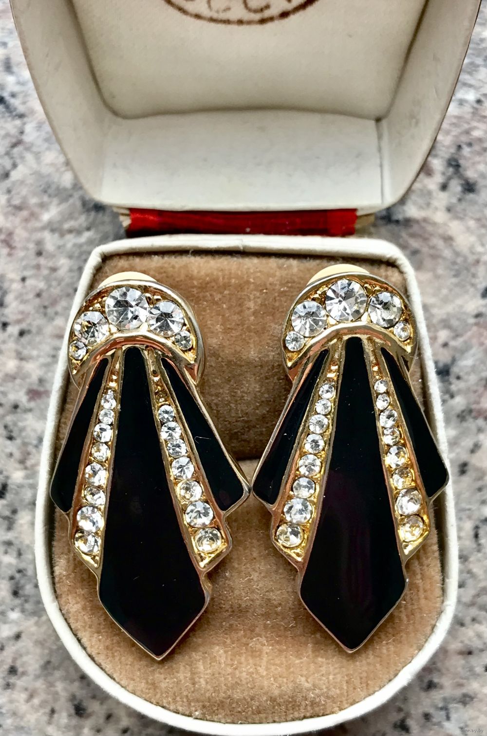 Крупные (высота 3,5см.) винтажные клипсы в стиле ар-деко, основа выполнена из бижутерного сплава золотого тона, лицевая сторона украшена чёрной эмалью и кристаллами, на одной клипсе не хватает одного самого мелкого кристалла, в носке не заметно. Замок держит надёжно.