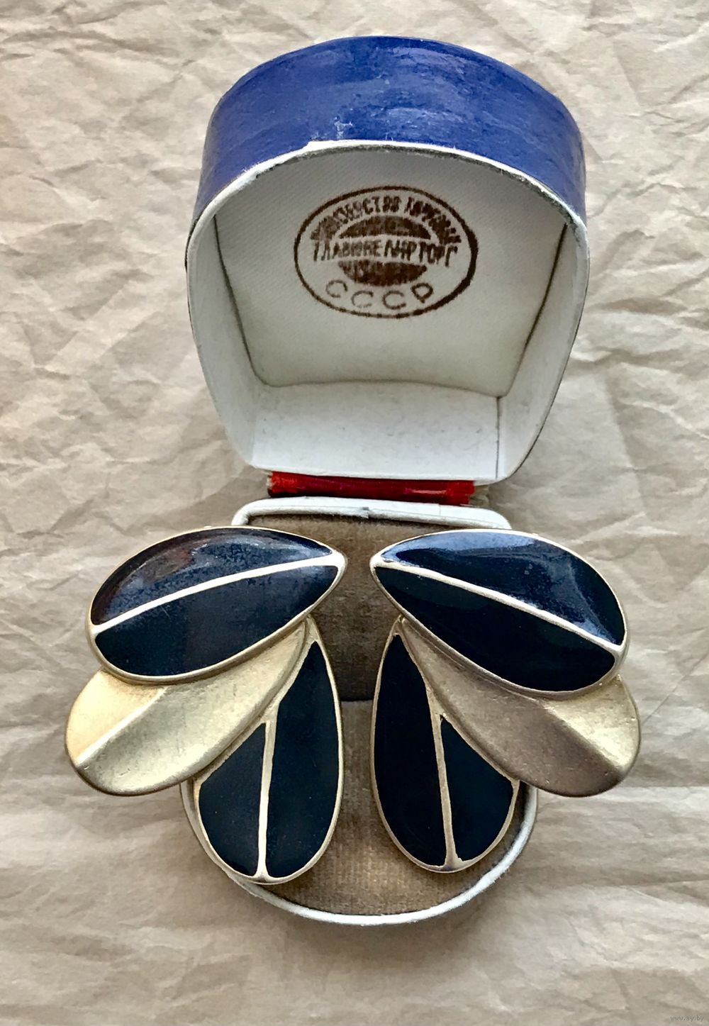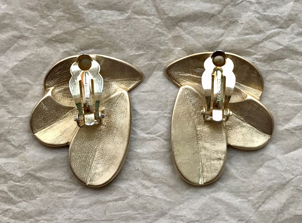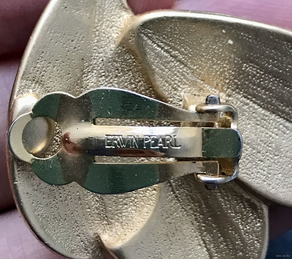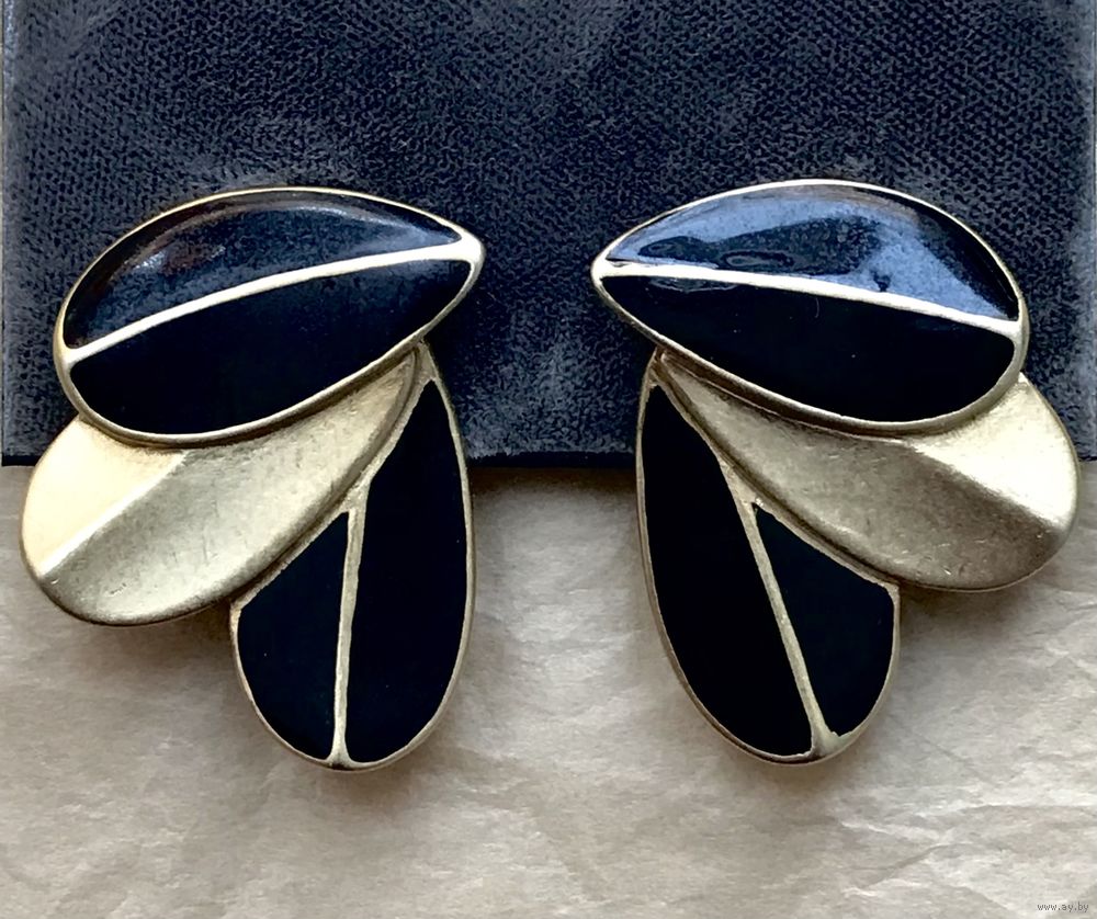 Крупные винтажные клипсы американского дизайнера Erwin Pearl. Изготовлены из бижутерного сплава золотого тона, лицевая сторона украшена эмалью чёрного цвета. Размер клипсы 4х3см. Маркированы. Состояние хорошее.