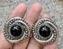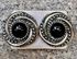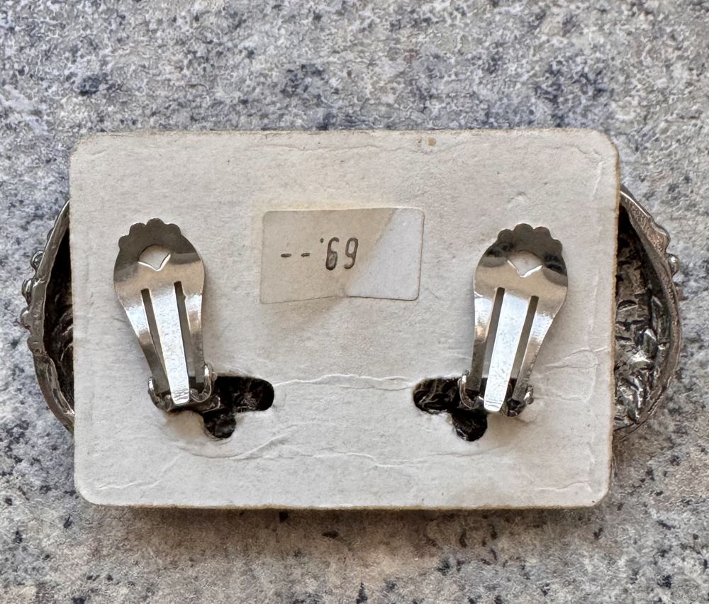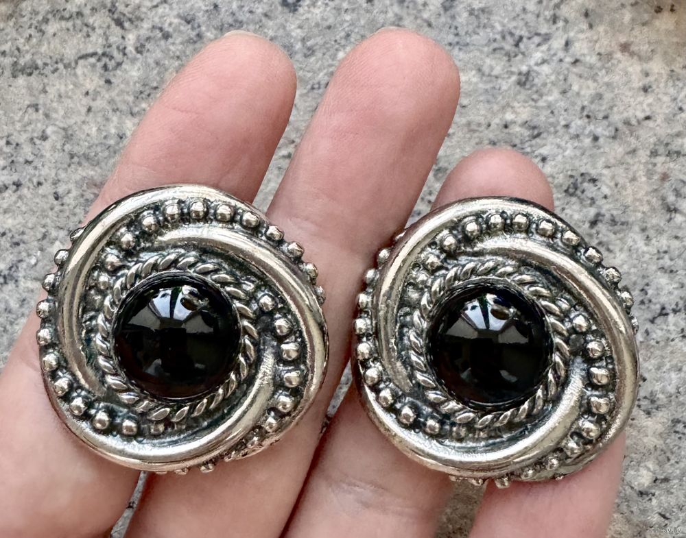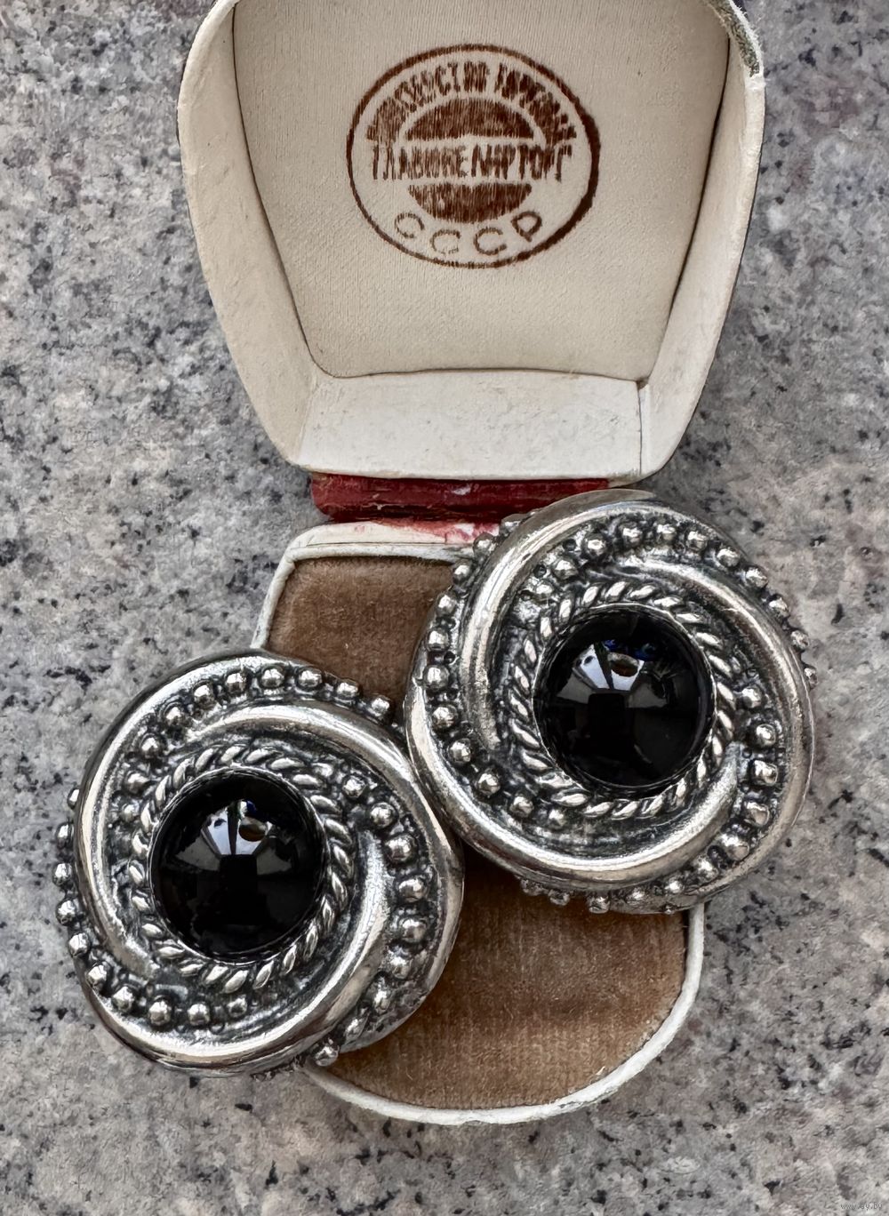 Крупные винтажные клипсы из металла серебристого тона, вставка из стекла чёрного цвета. Диаметр клипсы 3,3см., диаметр вставки 1,3см. На родной подложке. Состояние хорошее.