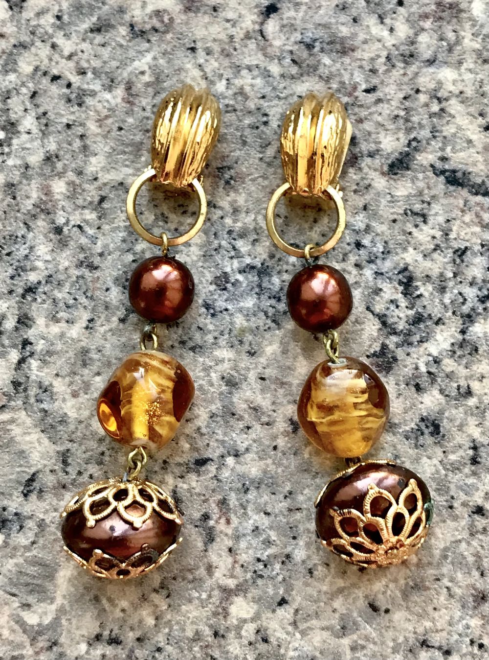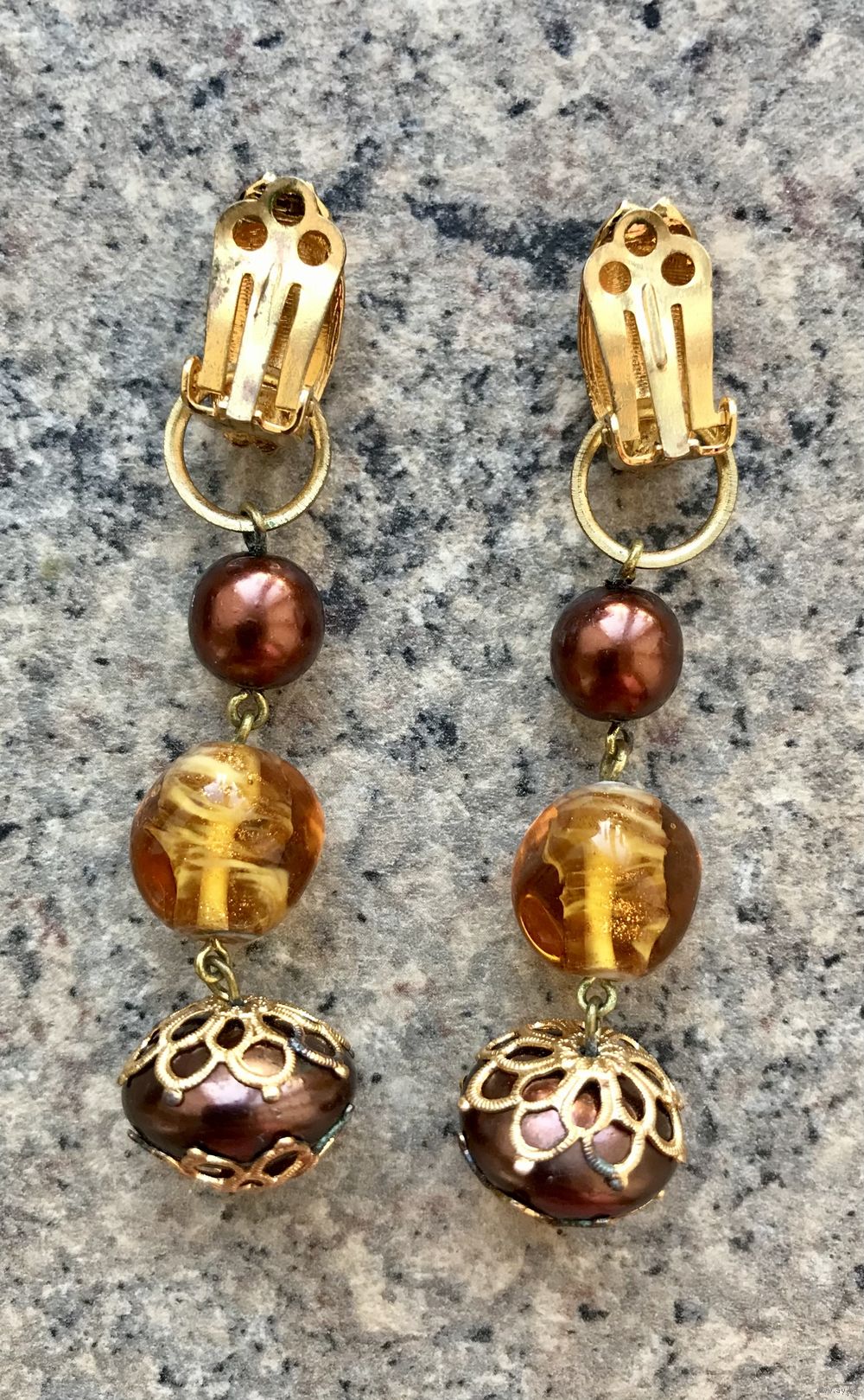 Крупные винтажные клипсы-трансформеры с основой из бижутерного сплава золотистого тона и подвесок из художественного стекла. Подвески можно снимать. На нижних бусинах на обрамлении из металла есть небольшие потемнения (этот нюанс учтён в цене). Высота клипсы 7см. Тяжеленькие, но замки комфортные и держат надёжно.