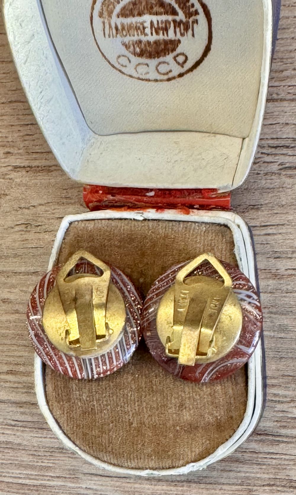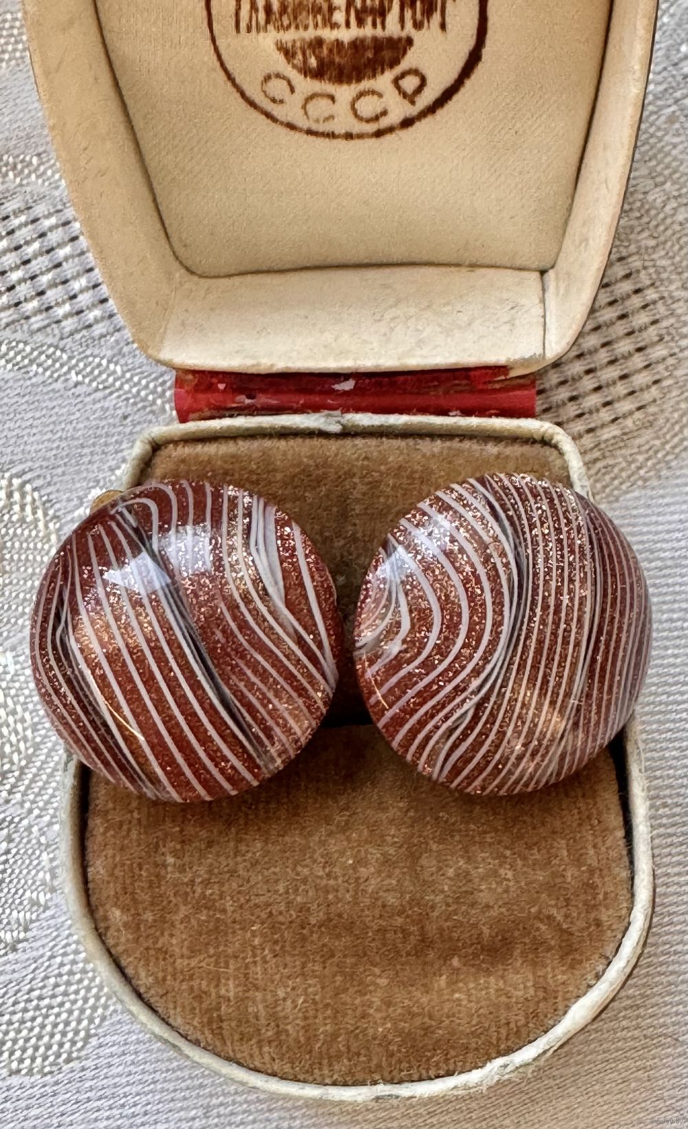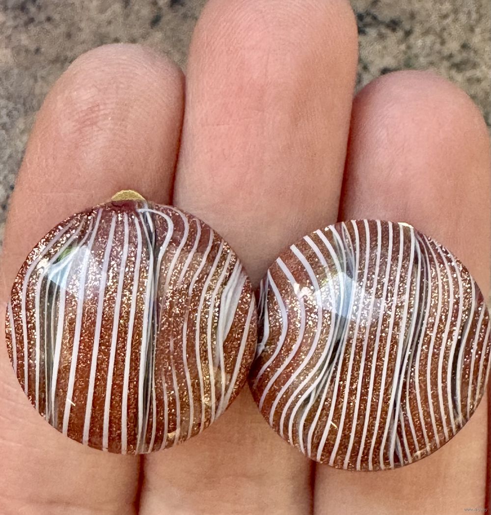 Винтажные клипсы из художественного стекла, зажимы из латуни. Сделаны в Италии. На каждом зажиме стоит отметка Made Italy. Диаметр 2см. Состояние хорошее.