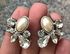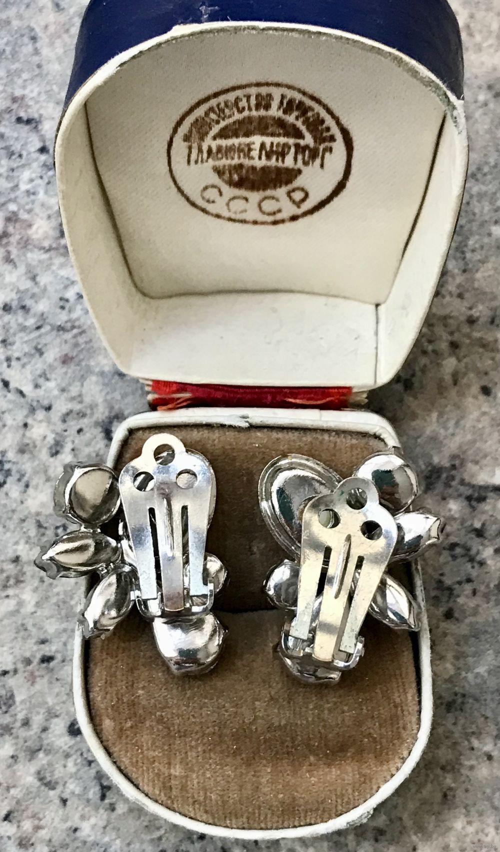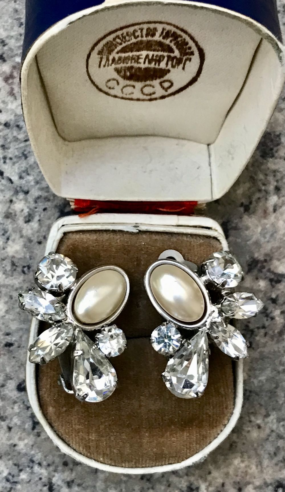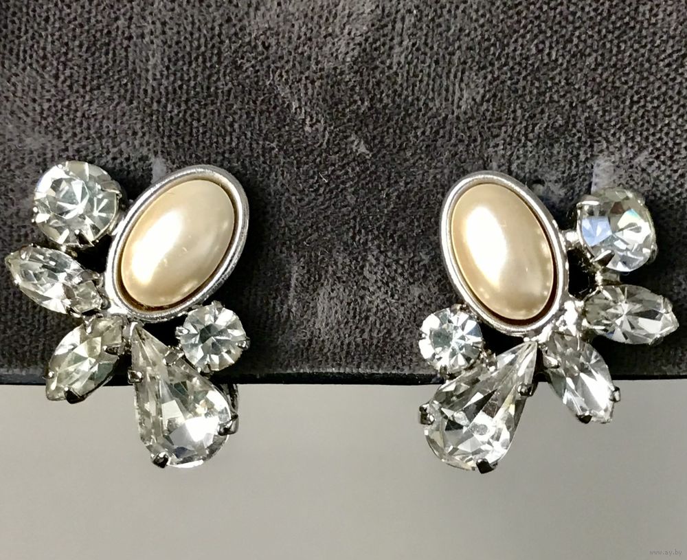 Винтажные крупные клипсы с основой из металла серебристого тона. Вставки из кристаллов и стекла с покрытием под жемчуг. Размер клипсы 2,5х2,2см. На вставках под жемчуг есть небольшие царапки.