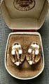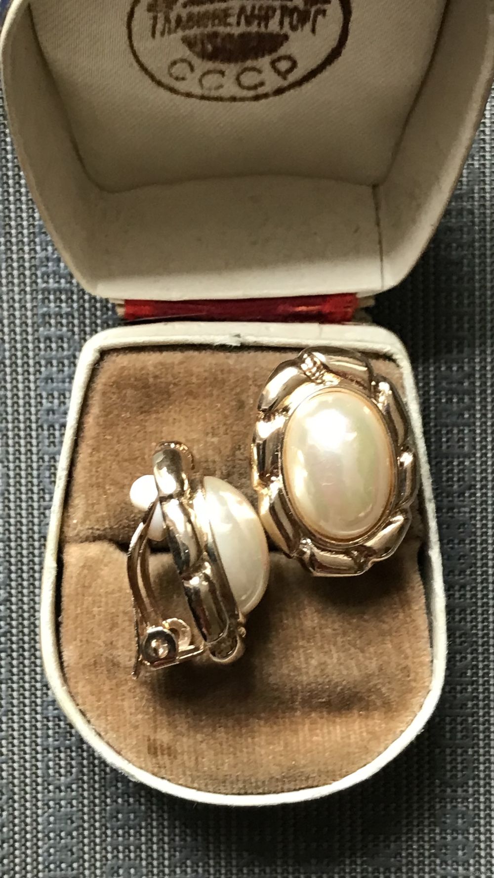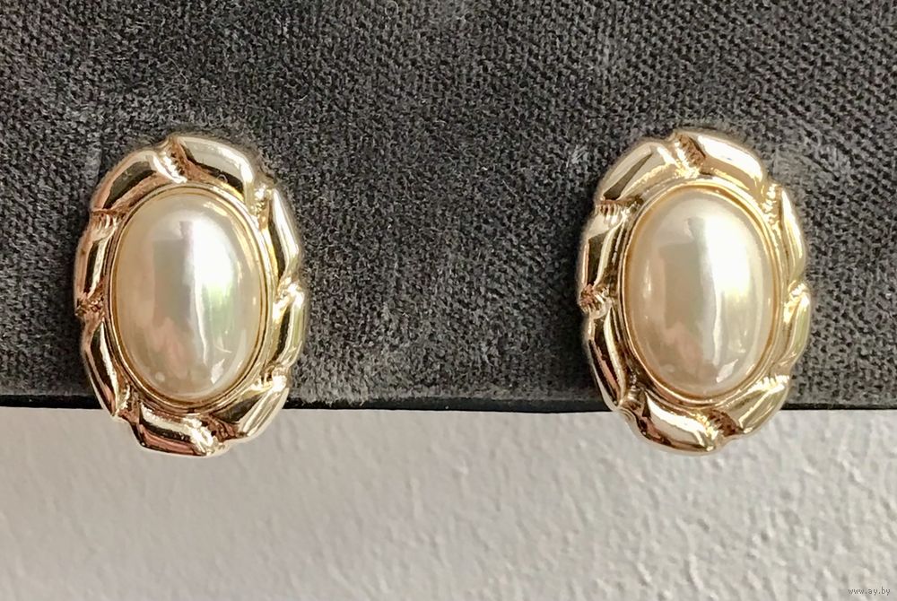 Винтажные клипсы с основой из металла золотого тона, на лицевой стороне вставки под жемчуг. Размер клипсы 2,2х2,5см., размер вставки 1,8х0,8см. Маркированы, атрибутировать не удалось. Состояние хорошее.