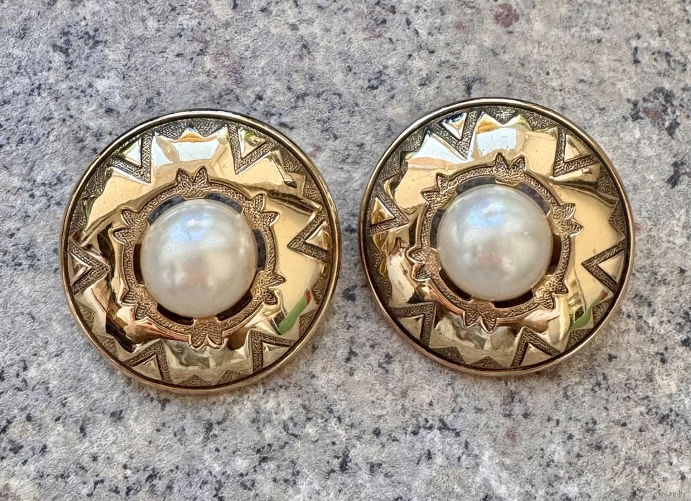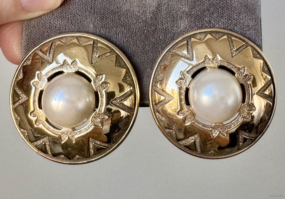 Крупные винтажные клипсы известного австрийского бренда Pierre Lang. Изготовлены из металла золотого тона, вставки под жемчуг (на вставках имеются незначительные царапки, что учтено в цене). Диаметр клипсы 4см., диаметр вставки 1,5см. Маркированы.