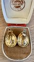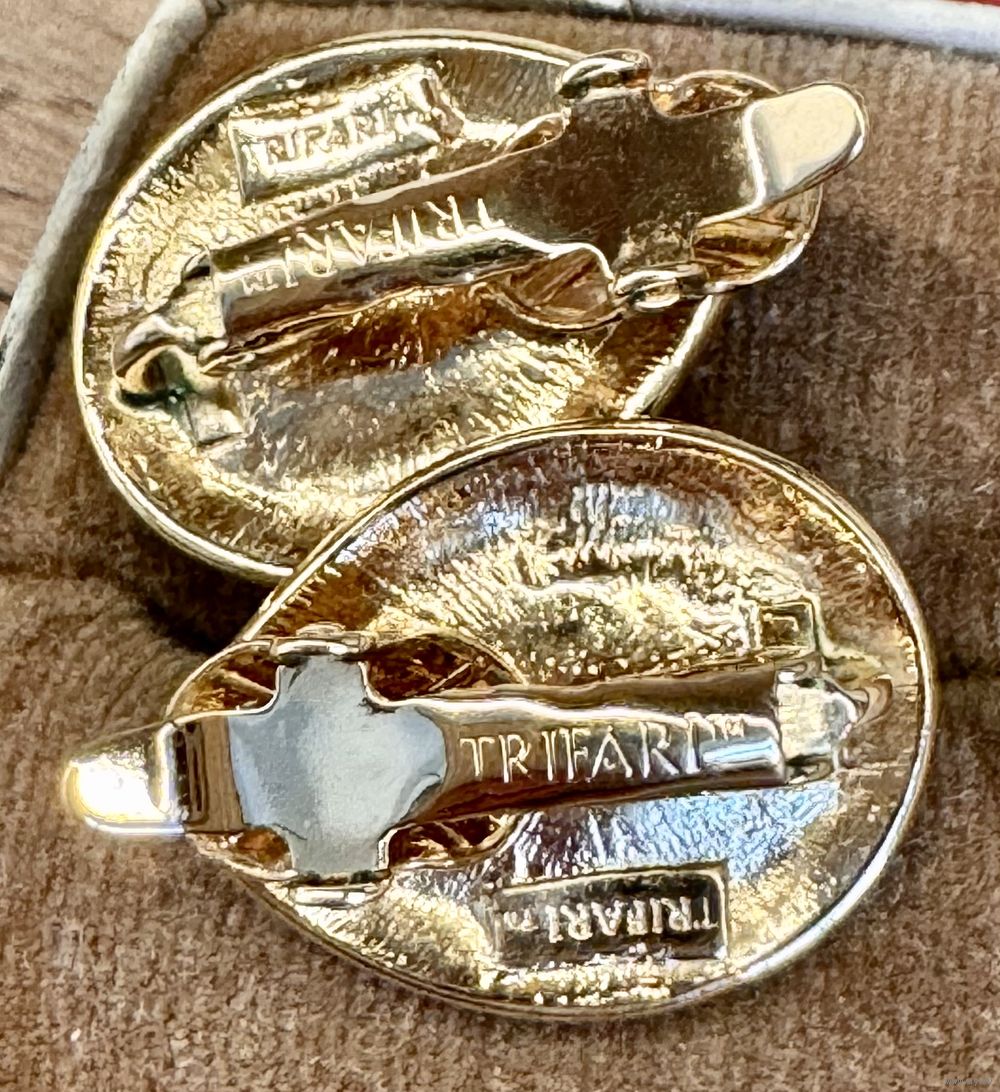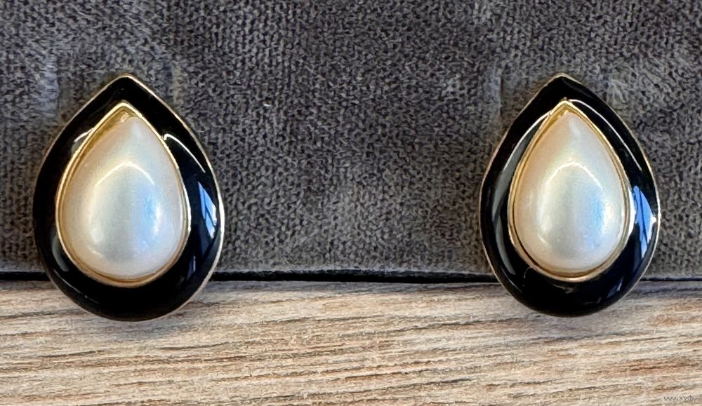 Винтажные клипсы американского бренда Trifari (сделаны в конце 80-х гг.). Основа из металла золотого тона, на лицевой стороне эмаль чёрного цвета и вставка каплевидной формы под жемчуг (пластик). Высота 2,2см., маркированы. Состояние хорошее.