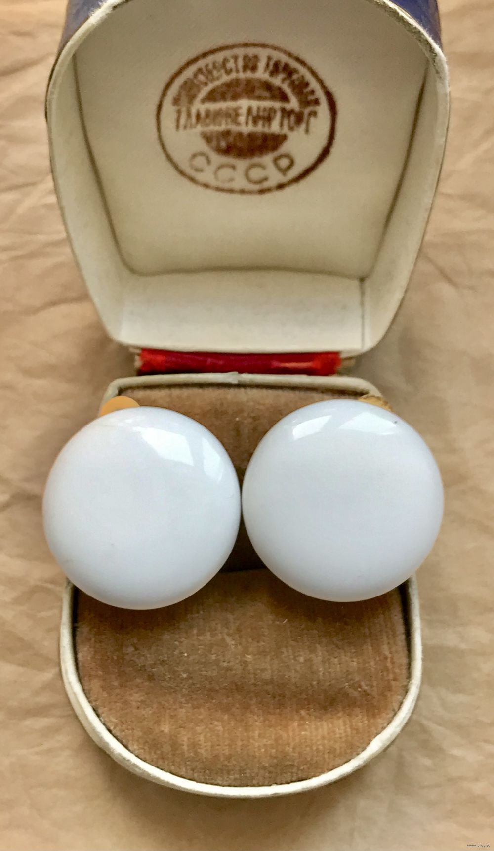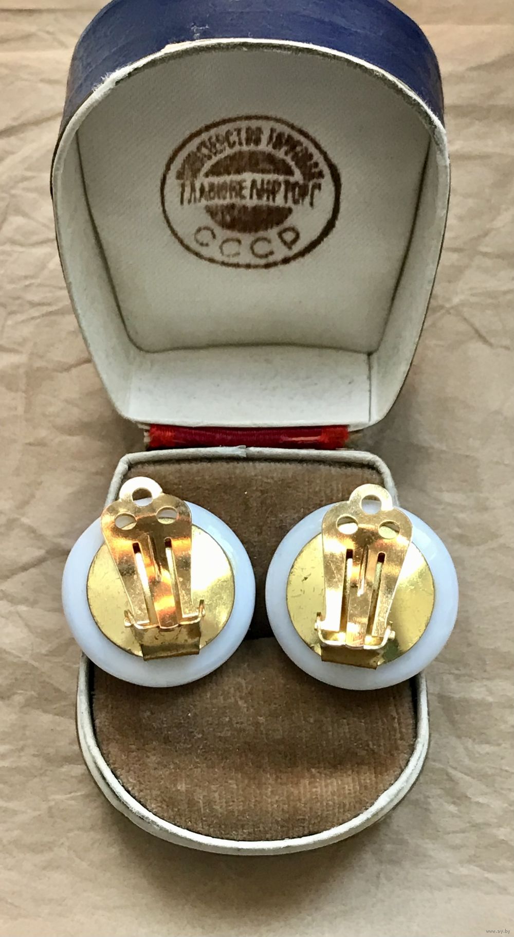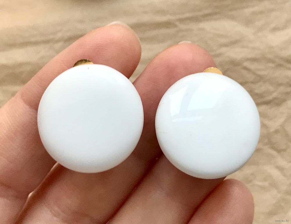 Винтажные клипсы с основой из латуни с позолотой, лицевая сторона украшена стеклом белого цвета (местами есть незначительные царапки). Диаметр клипсы 2,2см.