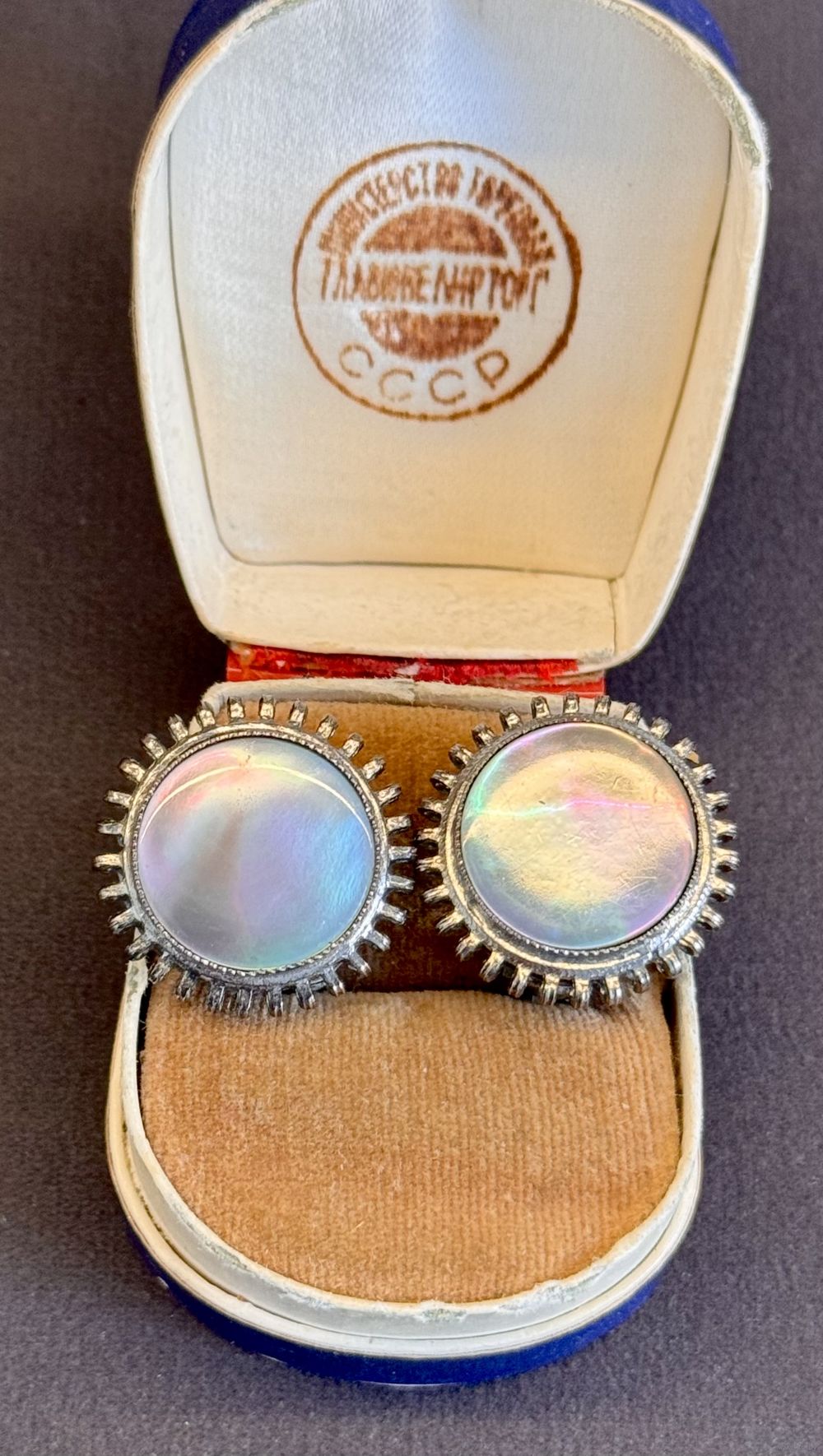 Винтажные клипсы из металла серебристого тона, лицевая сторона украшена вставкой из перламутра. Диаметр клипсы 2,2см., диаметр вставки 1,5см. Состояние хорошее.